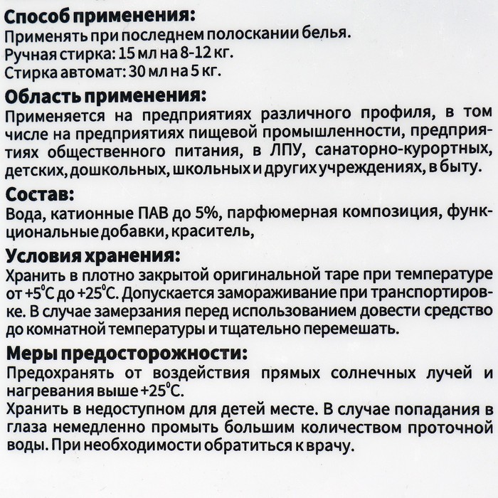 Концентрированное средство для обработки тканей. Предназначен для проведения антиэлектростатической обработки, кондиционирования и смягчения цветных и белых изделий из синтетических, искусственных и смешанных тканей. Подходит для использования в стиральных машинах любого типа. Перед применением встряхнуть. Не требует предварительного разбавления водой. Применяется на предприятиях различного профиля, в том числе на объектах пищевой промышленности, предприятиях машиностроительного комплекса, торговых и деловых центрах, медицинских, детских и дошкольных учреждениях, научных, финансовых и иных учреждениях, на всех видах транспорта, объектах жилищно-коммунального хозяйства.