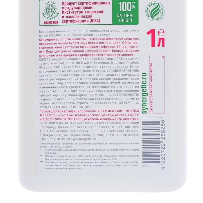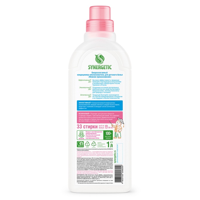 Габариты: 26,5 x 9 x 6,5 Доставка: Платная Страна: Россия В боксе: 8 шт Состав: См. на упаковке Материалы: см. на упаковке Фасовка: по 1 шт Индивидуальная упаковка: Без упаковки Сертификат: Не подлежит сертификации Объём, л: 1 Ароматизированные: Да Назначение: Для всех видов тканей Вид средства: Кондиционер Особенности средства: Экосредство Антибактериальное: Нет Вес/Объём: 1 л Биоразлагаемый кондиционер-ополаскиватель для детского белья SYNERGETIC "Нежное прикосновение" – высокоэффективное средство, бережно ухаживающее за всеми типами ткани, в том числе деликатными, и придающее особую мягкость и нежность белью после стирки. Гипоаллергенный кондиционер-ополаскиватель нейтрализует остатки средств для стирки на ткани, помогает сохранить структуру ткани, защищая волокна от изнашивания и повреждения. Средство обладает антистатическим эффектом. Комплекс растительных К-тензидов обеспечивает легкую глажку белья после стирки и высыхания. Подходит для ручной и машинной стирки, полностью выполаскивается из тканей. Кондиционер безопасен для белья новорожденных 0+ и одежды людей с чувствительной кожей. Не содержит ароматизаторов и красителей. Международный экологический сертификат ICEA подтверждает биоразлагаемость, безопасность и эффективность средства. Дерматологически протестирован в Европе. Биоразлагаемые компоненты не вредят микрофлоре септических установок. Гипоаллергенный кондиционер имеет экомаркировку "Листок жизни". Этот знак на упаковке - гарантия экологической безопасности продукта для человека и окружающей среды. При стирке добавить 30 мл кондиционера на пять килограммов белья. Беречь от детей. При попадании средства в глаза промыть водой. Использовать строго по назначению. Состав:Подготовленная вода > 30%; К-тензиды (ПАВ из растительного масла) 5–15%; парфюмерная композиция с эфирными маслами жасмина, пачули, розы, нероли и ветивера; пищевой краситель. Комментарии к товару