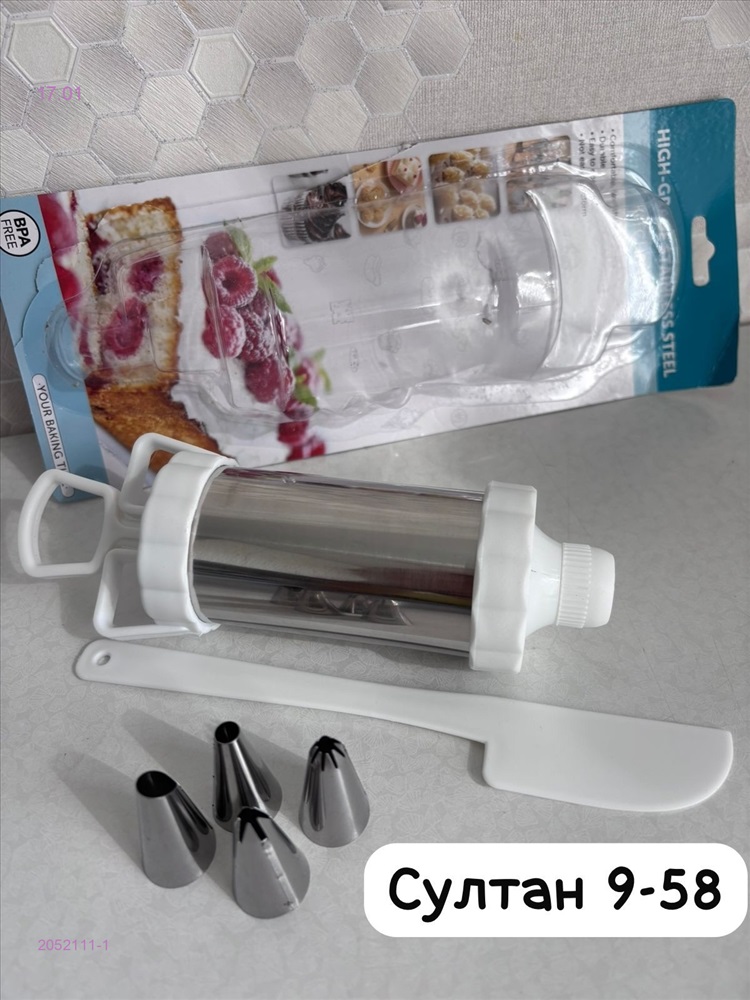 В наборе: шприц 18 см, лопаточка 18 см, 4 кондитерские насадки (3 см)