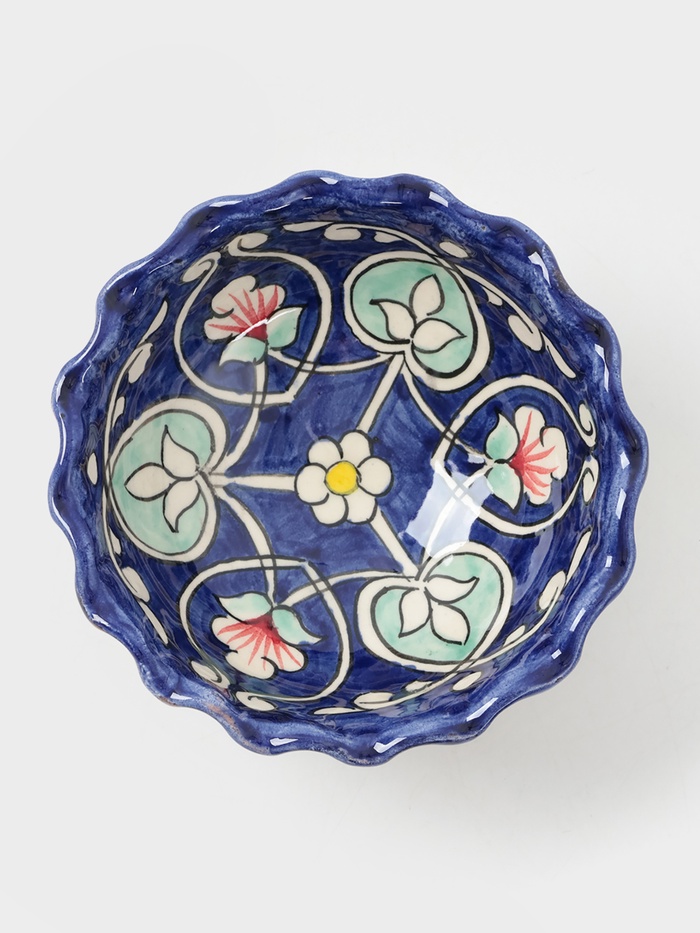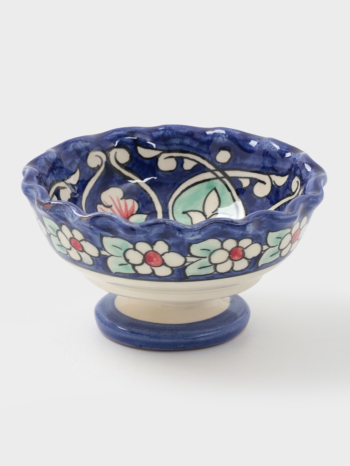 Конфетница вдохновлена знаменитой риштанской керамикой, где каждая деталь создаётся вручную. Цветочно-растительный орнамент напоминает узоры, традиционные для узбекского декора — такие же, как на старинных посудинах из Риштана. Такое изделие органично дополнит интерьер, наполненный восточными мотивами или современной этнической кухней.
