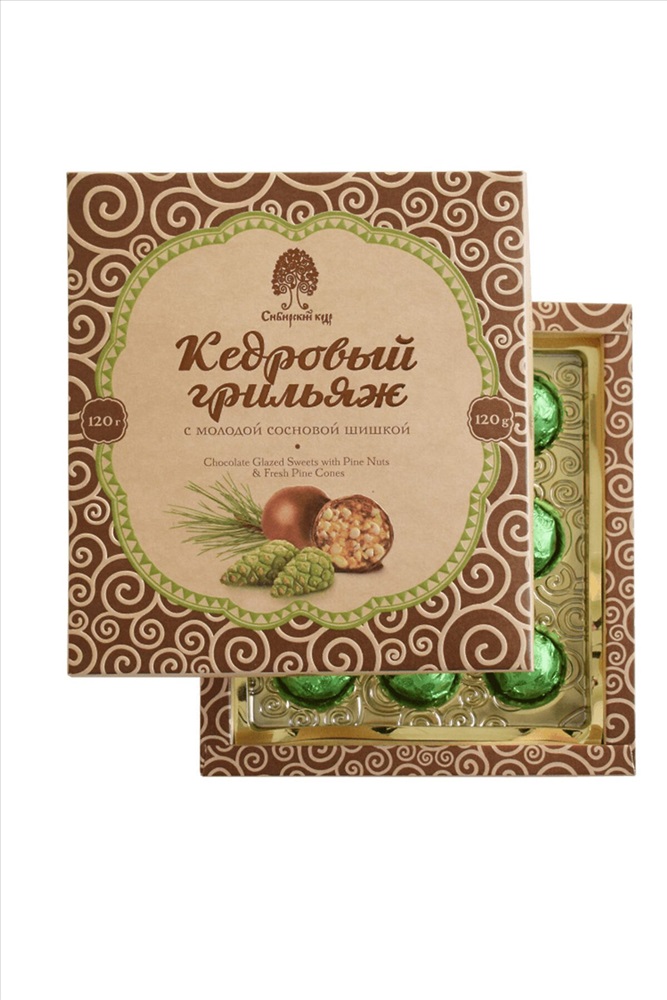 ID товара: 1187494 Состав: Ядро кедрового ореха, шоколадная глазурь (сахар, какао-масло, какао-порошок, эмульгатор лецитин), ядро кешью, мед натуральный, шишка сосновая, сахар. Сезон: Демисезон Производитель: Сибирский кедр Срок годности (мес): 6 Вес: (г), 120 Страна бренда: Россия Страна производства: Россия Конфеты "Кедровый грильяж" с сосновой шишкой в шок глазури 120г Комментарии к товару