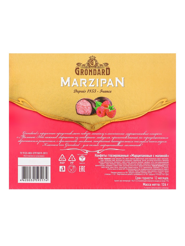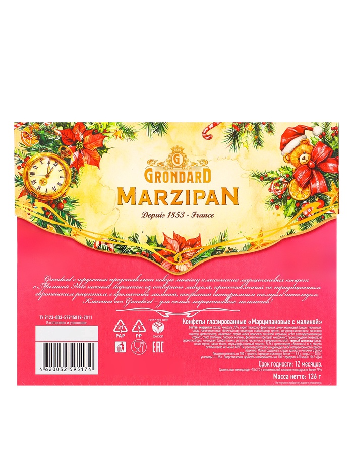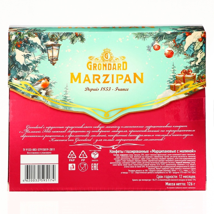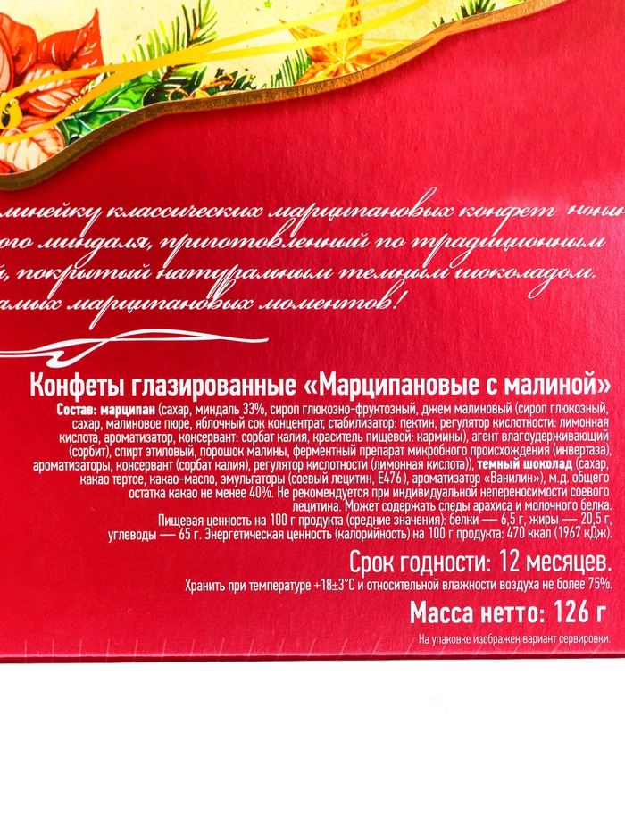 Габариты: 17,5 x 14,5 x 4 Страна: Россия В боксе: 10 шт Состав: См. на упаковке Материалы: см. на упаковке Фасовка: по 1 шт Индивидуальная упаковка: Цветная картонная коробка Сертификат: ЕАС Белки, г: 6,5 Жиры, г: 20,5 Углеводы, г: 65 Вес нетто, г: 126 Энергетическая ценность, ккал: 470 Тематика: Новогодняя Символ года: Нет Тематика праздника: Новый год, Рождество Вкус: Малина Вид: Марципан Форма: Конфета Вид шоколада: Кондитерская глазурь Добавки: С малиной Марципановые конфеты - это не просто сладость, это настоящий волшебный подарок, который принесет радость и удовольствие в самые долгожданные моменты праздничного сезона. Конфеты глазированные с начинкой из сладкой малины никого не оставят равнодушным, и непременно подарят своему счастливому обладателю неповторимое наслаждение. Подарите себе и своим близким ассорти шоколадных конфет и создайте моменты настоящей радости и волшебства. Пусть каждый кусочек этого шоколада подарит вам улыбку, уют и незабываемые впечатления! Комментарии к товару