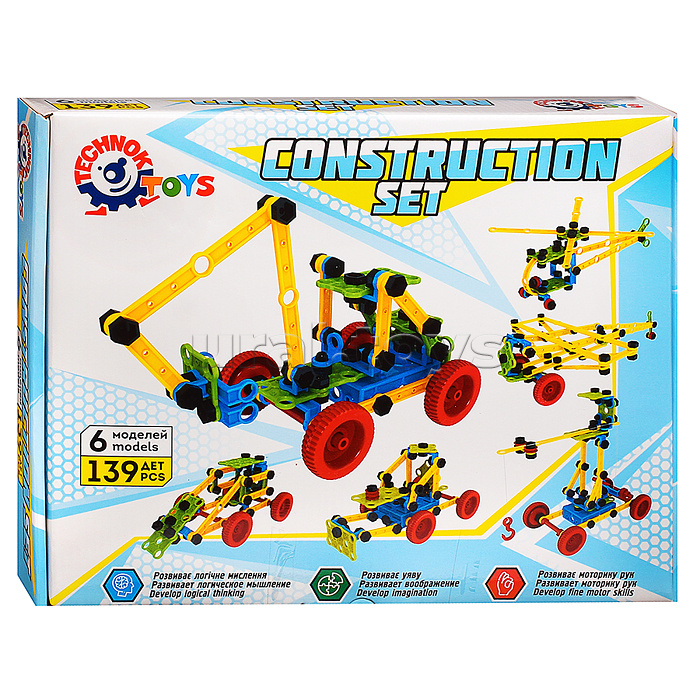 Конструктор: • В наборе: 139 деталей. • В комплекте гаечный ключ. • Материалы: пластик. • Соответствует требованиям безопасности продукции. • Для детей от 3-х лет.