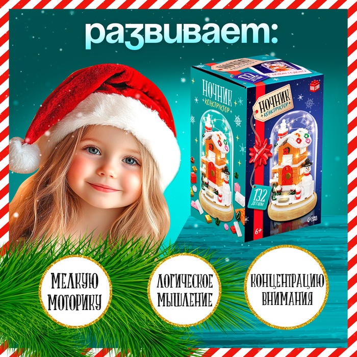 Удивите ребёнка увлекательным и полезным новогодним подарком! Блочный конструктор с гирляндой легко и интересно собирать, а после — украсить получившимся ночником прикроватную тумбочку! Тёплый мягкий свет будет создавать уютную праздничную атмосферу в детской комнате.