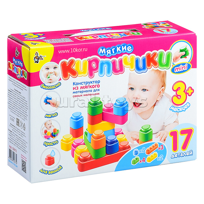 Код: 320273 Страна производитель: Россия Размеры упаковки: 26 x 20 x 10 см Количество в коробке: 6 • Количество деталей: 17. • Детали прочно крепятся между собой, и их можно крутить. • С мягкими кирпичиками можно играть в ванной и в песке. • Детали конструктора легко моются. • Детали имеют простую систему соединения, которую легко освоят даже самые маленькие непоседы. • Кирпичики изготовлены из мягкого композиционного полимера, гибкого и приятного для детских ручек. • В комплекте: - одинарный элемент 40х40х40 мм - 8 шт. - двойной элемент 40х80х40 мм - 4 шт. - тройной элемент 40х120х40 мм - 2 шт. - четверной элемент 40х160х40 мм – 3 шт. • Соответствует требованиям безопасности продукции. • Для детей от 3-х месяцев. Комментарии к товару