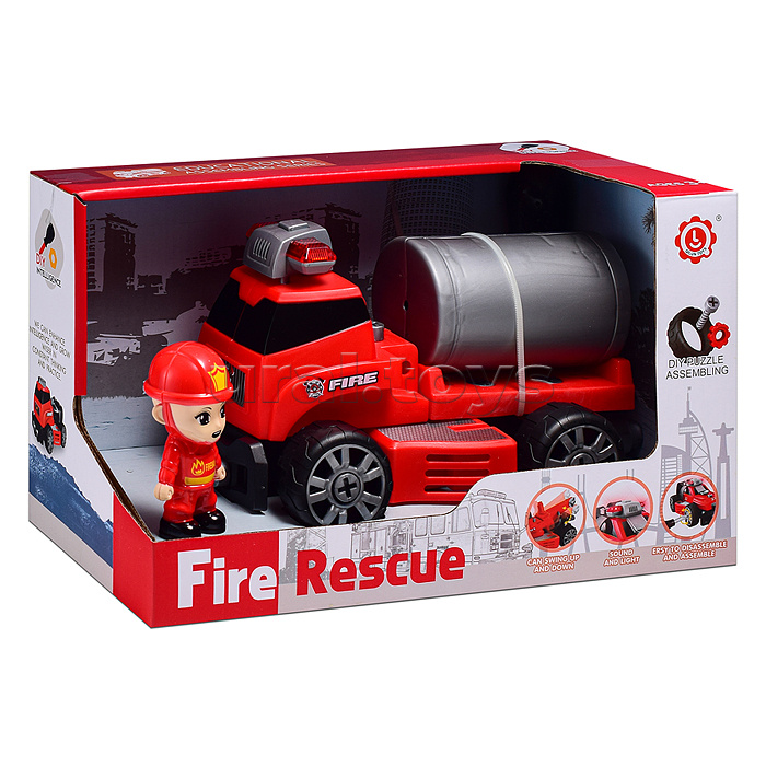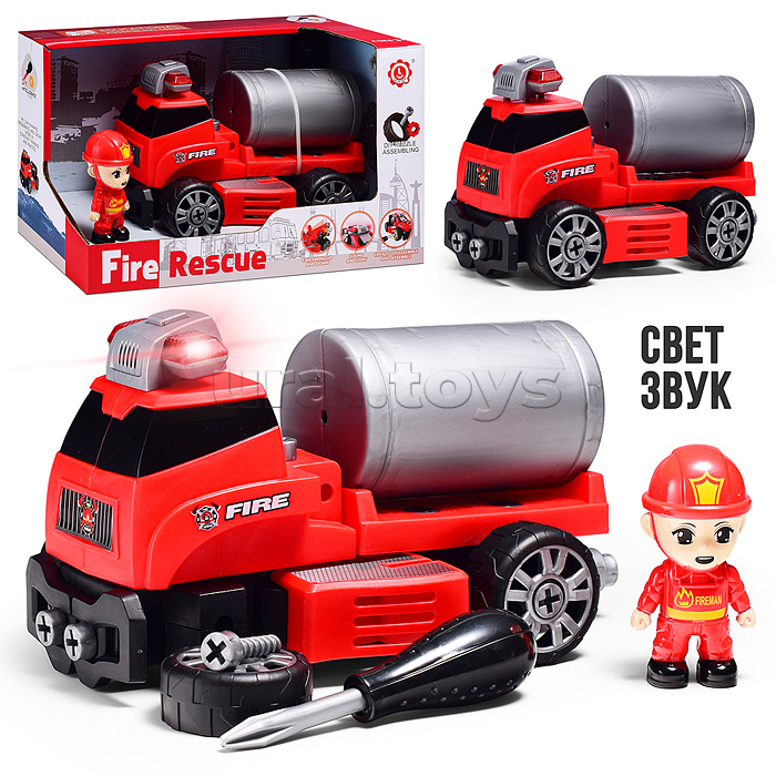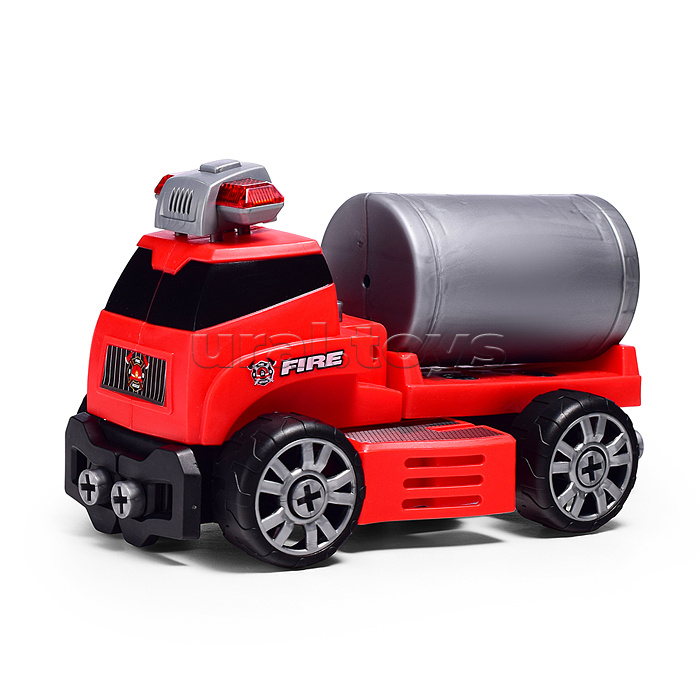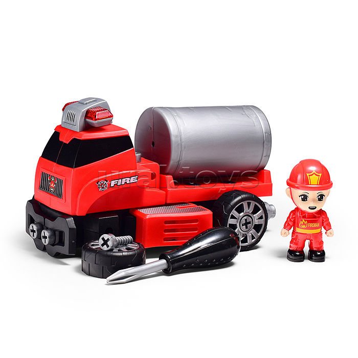 • В комплекте 38 элементов: - машина-конструктор, - отвёртка, - фигурка пожарного (9 см.). • Размеры машины (ДхШхВ): 22х13х14 см. • Особенности игрушки: • детали машины можно разобрать, открутив болты отвёрткой, а потом собрать машину снова; • бочка съёмная; • машина без инерционного механизма; • с кнопки включается и выключается мерцающий свет проблескового маячка и звуки сирены. • Материал: пластмасса, полимерные материалы. • Для работы света и звука используются 3 батарейки типа AG3/LR41 (входят в комплект для демонстрации). • Соответствует требованиям безопасности и стандартам качества продукции. • Для детей от 3-х лет.