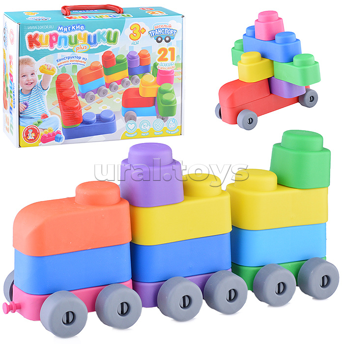 Мягкие кирпичики для детей «Весёлый транспорт» из 21 детали с колёсиками – это не только возможность собрать разнообразный вид транспорта от автомобиля до вертолета, но и способ развить в ребёнке творческие способности и тактильные навыки. С красочными мягкими кирпичиками на колёсиках можно не только строить здания, но и собирать самый различный транспорт: автомобили, вертолёты, поезда. Детали прочно крепятся между собой, и их можно крутить. С мягкими кирпичиками можно играть в ванной и песке. Детали конструктора легко моются. Кирпичики изготовлены из мягкого пластика, гибкого и приятного для детских ручек. Материал конструктора абсолютно безопасен, даже если захочется попробовать кирпичик на вкус. В комплект входят: 53 детали из мягкого пластика: • одинарный элемент 40х40х40 мм. - 5 шт. • двойной элемент 40х80х40 мм. - 8 шт. • тройной элемент 40х120х40 мм. - 2 шт. • четверной элемент 40х160х40 мм. – 1 шт. • двойной элемент с зацепами 40х80х30 мм. - 3 шт. • закруглённый одинарный элемент 40х80х40 мм. - 2 шт. • колёсики 30х30х15 мм. - 16 шт. • крепления для колёсиков - 16 шт. Соответствует требованиям безопасности продукции. Игра предназначена для детей от 3 лет.