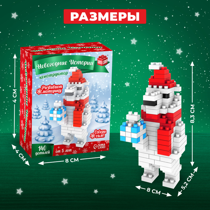 Габариты: 10,5 x 8 x 4 Страна: Китай В боксе: 240 шт Состав: Пластик Материалы: пластик Фасовка: по 1 шт Индивидуальная упаковка: Картонная коробка Габариты товара: 3,3 см × 5,2 см × 8,3 см Сертификат: ЕАС Для кого: Унисекс Возраст: От 5 лет Среднее время сборки, мин: 75 Количество элементов: 140 Тематика праздника: Новый год Материал: Пластик Тематика конструктора: Новогодняя Уровень сложности: Средний Размер деталей: Мини блоки Маленькому любителю волшебства непременно понравится новогодний конструктор. С ним ребёнок не только разыграет праздничный сюжет, но и сможет придумать свои истории. Особенности конструктора