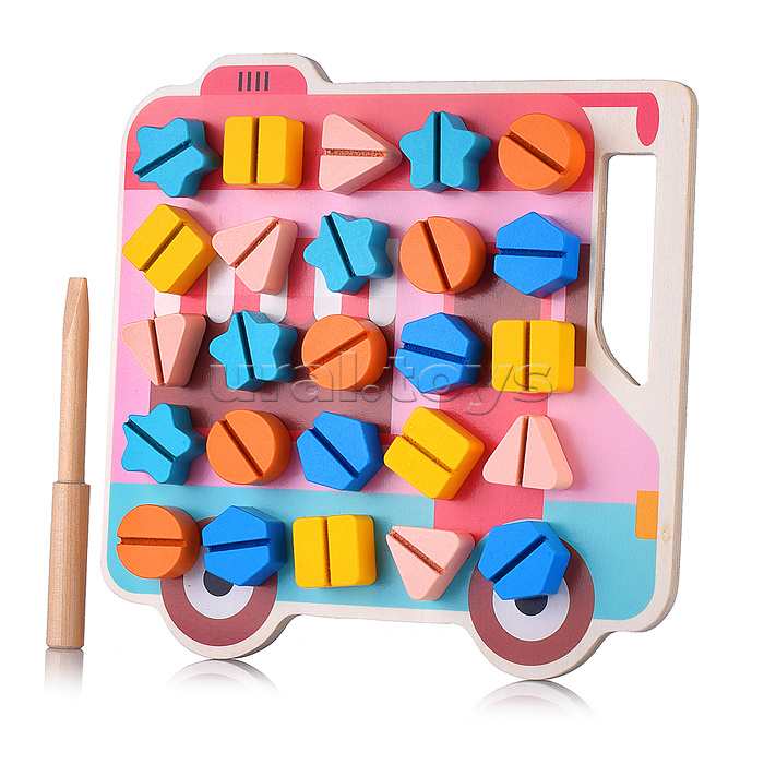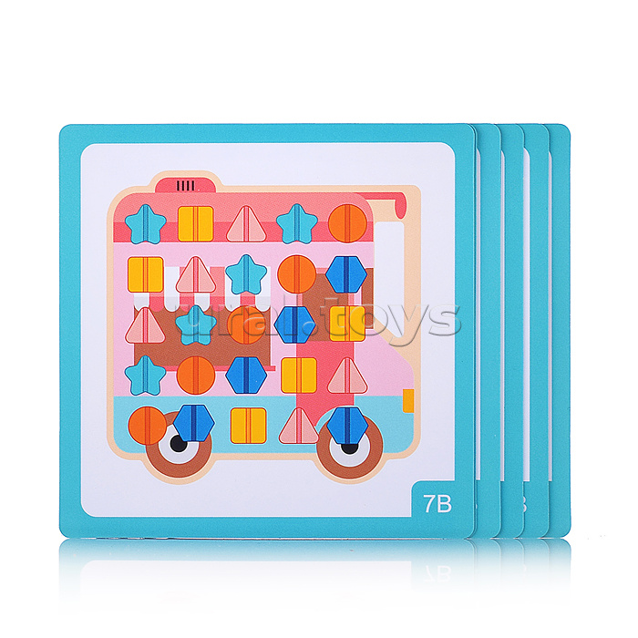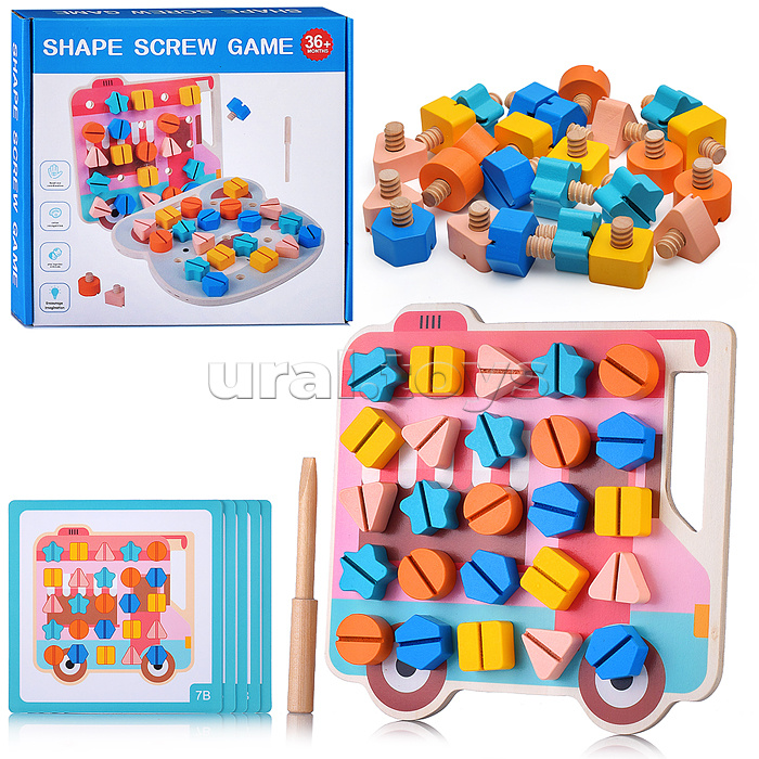 • В наборе: - рамка (22х22 см.) - 25 деталей с винтами вкручивающимися в рамку. - деревянная отвёртка. - 8 двусторонних карточек с вариантами расположения деталей. • Материалы: дерево, картон. • Соответствует требованиям безопасности продукции. • Для детей старше 3-х лет.