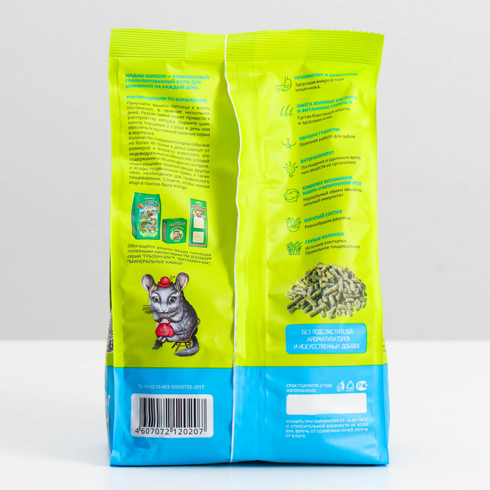 Габариты: 10,5 x 4 x 21,5 Доставка: Платная Страна: Россия В боксе: 12 шт Состав: Зерно, злаки Материалы: зерно, злаки Фасовка: по 1 шт Индивидуальная упаковка: Без упаковки Сертификат: СТР Вес, г: 500 Особенности корма: Основной Вид: Гранулированный Назначение: Для шиншилл Возраст: Для всех возрастов Темпер. ограничение НЕ НИЖЕ ℃: +1 Темпер. ограничение НЕ ВЫШЕ ℃: +30 Обеспечит вашему питомцу крепкое здоровье, высокий иммунитет и красивую пушистую шубку. Не следует забывать, что шиншилла должна обязательно получать вволю качественное сено. Важным дополнением рациона являются также веточки деревьев (ивы, березы, осины, дуба, яблони). Состав: люцерна, вика, луговые травы, злаковые культуры, семена злаковых и масличных культур, сухие овощи, минерально-витаминный комплекс, пробиотик, пребиотик и энтеросорбент. Содержание витаминов в 100 г корма: A - 600 ME; D3 - 100 ME; E- 5,2 мг; С - 40 мг; B1 - 0,5 мг; B2 - 0,7 мг; B3 - 1,8 мг; B5 - 5,2 мг; B12 - 3 мкг; Bc - 50 мкг; K3 - 20 мкг Рекомендации по кормлению: Приучайте вашего питомца к корму постепенно, в течение нескольких дней. Резкая смена рациона может привести к растройству желудка. Кормить шиншиллу можно порциями 2-3 раза в день или обеспечить постоянное наличие корма в кормушке. Главное, чтобы на ночь зверьку всегда оставалась еда, поскольку шиншилла ведет ночной образ жизни. Шиншиллы - малоежки и обычно съедают в день не более 40 г. гранул. Это количество зависит от возраста животного, его индивидуальных особенностей, от условий содержания и объема дополнительного питания (сена, свежей травы и т.п.) Комментарии к товару