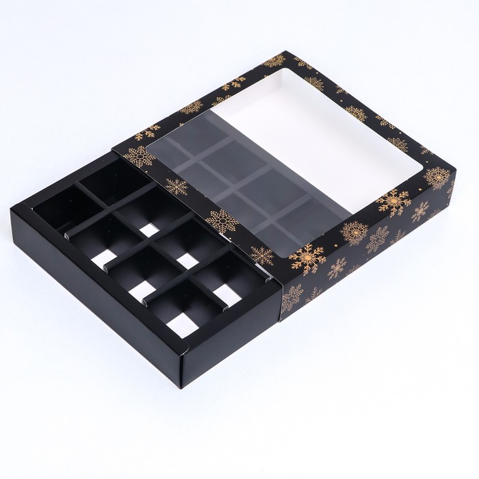 Коробка имеет квадратную форму и состоит из двух частей: верхней крышки и нижней части. Верхняя крышка украшена красивым рисунком, который подчеркивает новогоднюю тематику. Нижняя часть коробки предназначена для размещения конфет.