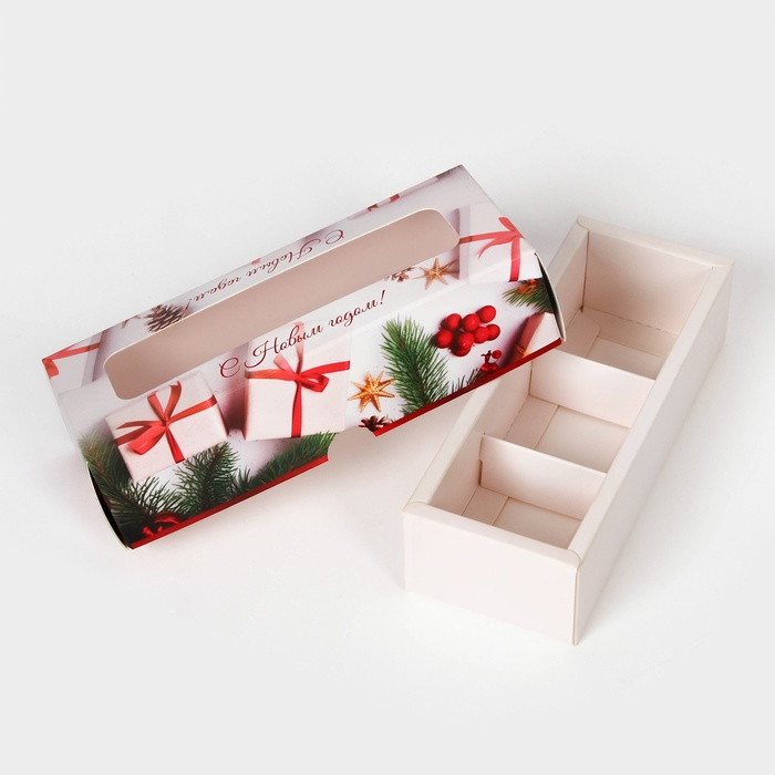 Коробка под 3 конфеты "Новогодняя" размером 13х5х3,3 см - это прекрасный выбор для упаковки сладостей к празднику. Она выполнена в ярких новогодних цветах, что создает атмосферу праздника и волшебства.