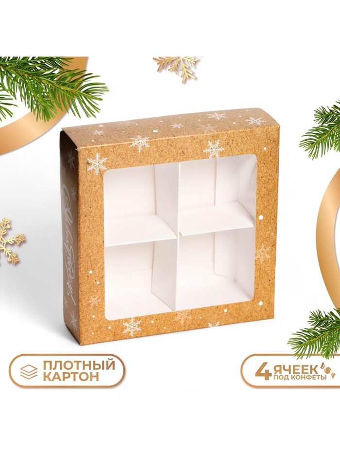 Габариты: 31 x 31 x 0,1 Страна: Китай В боксе: 563 шт Состав: PVC, картон Материалы: PVC, картон Фасовка: по 1 шт Индивидуальная упаковка: Пакет Сертификат: ЕАС Вид упаковки: Для конфет Цвет: Золотистый Форма: Квадратная Плотность, г/м²: 270 Длина, см: 12,6 Ширина, см: 12,6 Высота, см: 3,9 Количество ячеек: 4 Вместимость, шт.: 4 Тематика: Рождественская, Новогодняя Рисунок: Да Символ года: Нет Тематика праздника: Рождество, Новый год Материал: Картон Вид: Кондитерские коробки Вид еды: Для шоколада, Для десертов, Для конфет Вид: Квадратные, Складные коробки, Коробки-пеналы, Крафт коробки Размер: Малый (11-17 см) Дизайн: С рисунком, надписью Коробка под 4 конфеты "Новогодняя" размером 12,6 х 12,6 х 3,6 см - это прекрасный выбор для упаковки сладостей к празднику. Она выполнена в ярких новогодних цветах, что создает атмосферу праздника и волшебства. Коробка имеет квадратную форму и состоит из двух частей: верхней крышки и нижней части. Верхняя крышка украшена красивым рисунком, который подчеркивает новогоднюю тематику. Нижняя часть коробки предназначена для размещения конфет. Размеры коробки позволяют упаковать 4 штуки конфет, что делает ее удобной для использования в качестве подарка или для домашнего использования. Коробка изготовлена из качественного картона, который обеспечивает надежную защиту содержимого от внешних воздействий. Эта коробка для конфет станет прекрасным дополнением к новогоднему столу или подарком для близких и друзей. Она создаст праздничное настроение и подарит радость всем, кто получит такой подарок.