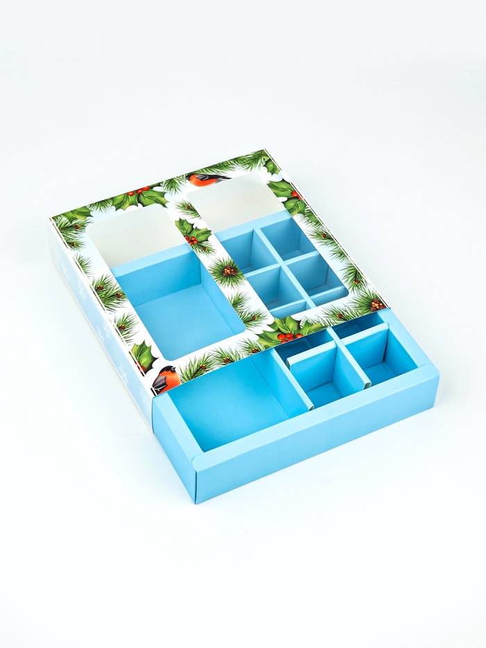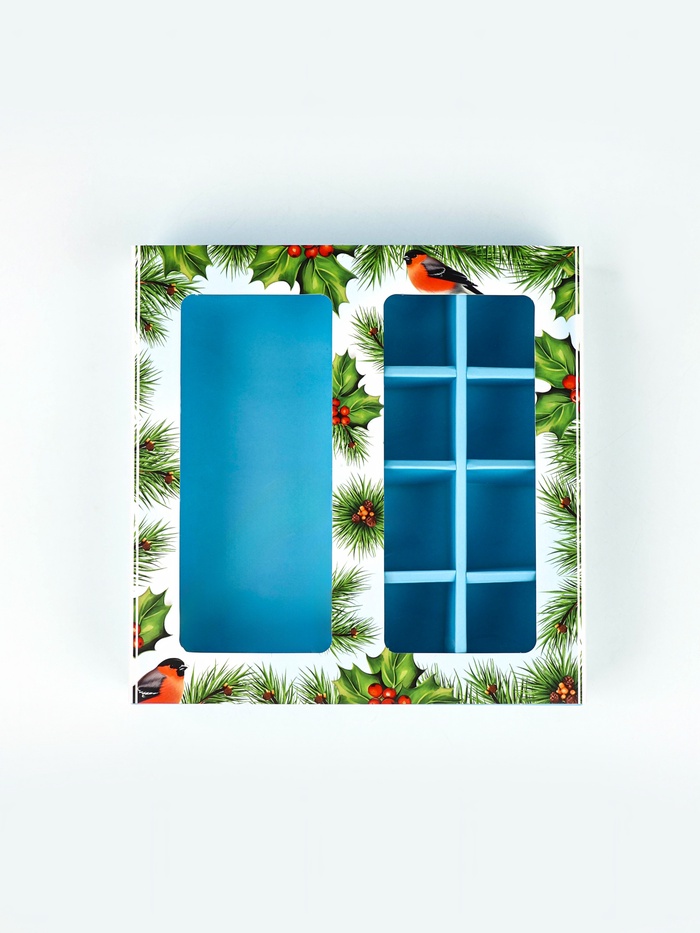 Одной из отличительных особенностей этой коробки является наличие окна, которое позволяет увидеть часть сладких угощений внутри. Это делает подарок ещё более привлекательным, поскольку дополнительно подчеркивает красоту и качество конфет и шоколада, находящихся внутри. Окно добавляет элемент интриги и создает ощущение волшебства, характерное для праздников.