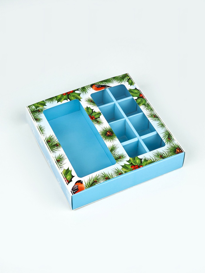 Изготовлена из высококачественного картона и имеет размеры 17,7 х 17,8 х 3,8 см, она идеально подходит для 8 конфет и одной плитки шоколада.