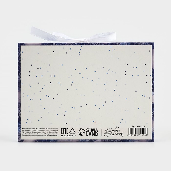 Габариты: 16,5 x 17 x 0,3 Страна: Россия В боксе: 300 шт Состав: Картон Материалы: картон Фасовка: по 1 шт Индивидуальная упаковка: Пакет Сертификат: ЕАС Цвет: Синий Форма: Прямоугольная Плотность, г/м²: 250 Длина, см: 16,5 Ширина, см: 12 Высота, см: 5 Допустимый вес вложения, г: 200 Тематика: Новогодняя Символ года: Нет Тематика праздника: Новый год Материал: Картон Вид: Складные коробки Размер: Малый (11-17 см) Окошко: Нет Крышка-дно: Нет Дизайн: С рисунком, надписью Комментарии к товару