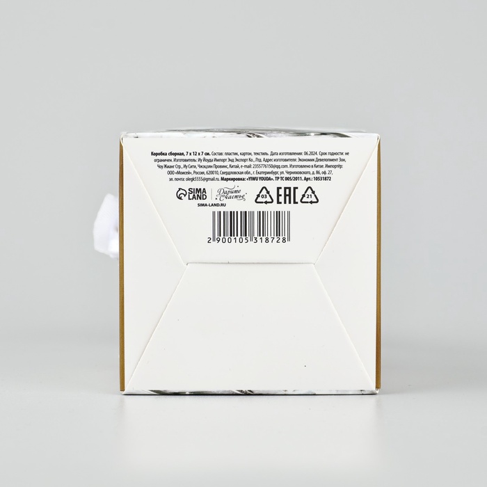 Габариты: 0,1 x 14,5 x 25 Страна: Китай В боксе: 350 шт Состав: Картон, пластик, текстиль Материалы: картон, пластик, текстиль Фасовка: по 1 шт Индивидуальная упаковка: Пакет Габариты товара: 7 см × 7 см × 12 см Сертификат: ЕАС Цвет: Белый Форма: Квадратная, Прямоугольная Длина, см: 7 Ширина, см: 7 Высота, см: 12 Допустимый вес вложения, г: 200 Тематика: Новогодняя Символ года: Нет Тематика праздника: Новый год Материал: ПВХ, картон Вид: Складные коробки Размер: Малый (11-17 см) Окошко: Нет Крышка-дно: Нет Дизайн: С рисунком, надписью Фиксированная цена: Да Комментарии к товару