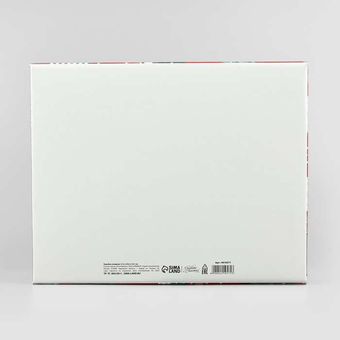 Габариты: 47 x 41 x 1 Страна: Россия В боксе: 36 шт Состав: Микрогофрокартон Материалы: микрогофрокартон Фасовка: по 1 шт Индивидуальная упаковка: Плёнка Сертификат: ЕАС Цвет: Белый, Красный Форма: Прямоугольная Длина, см: 31 Ширина, см: 25,5 Высота, см: 16 Глубина, см: 31,2 Допустимый вес вложения, г: 3000 Тематика: Новогодняя, Дом Рисунок: Да Крышка: Да Символ года: Нет Тематика праздника: Новый год Материал: Микрогофрокартон Колёса/ролики: Нет Вид: Складные коробки Размер: Большой (25-45 см) Окошко: Нет Крышка-дно: Да Дизайн: С рисунком, надписью При сборке коробки необходимо тщательно прогибать все биговки (линии сгиба), чтобы крепления плотно вошли в пазы. Комментарии к товару