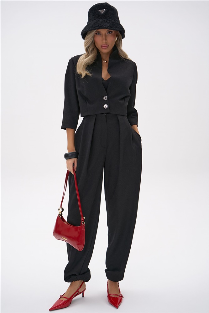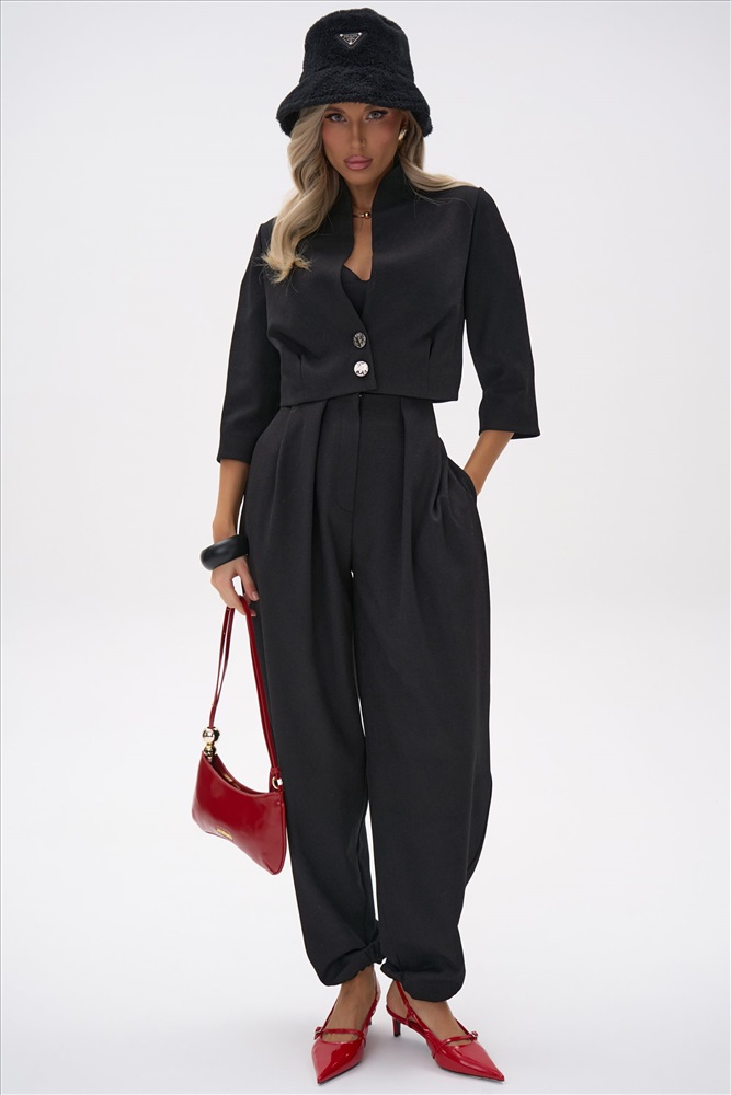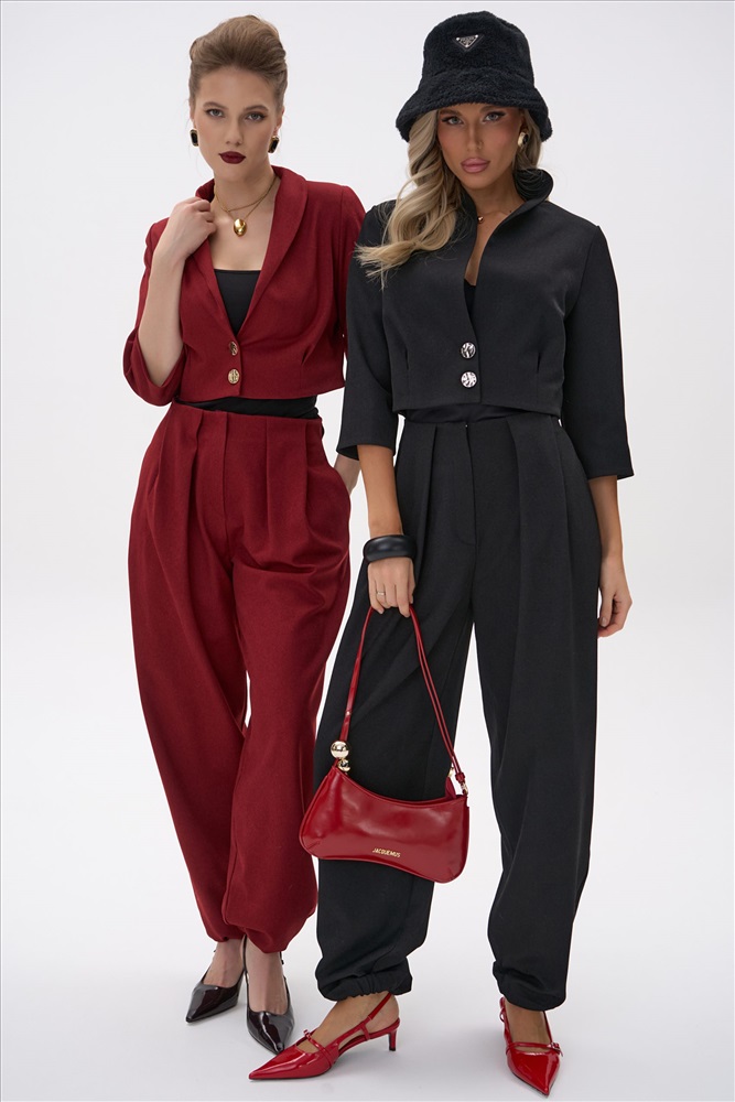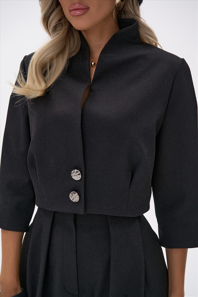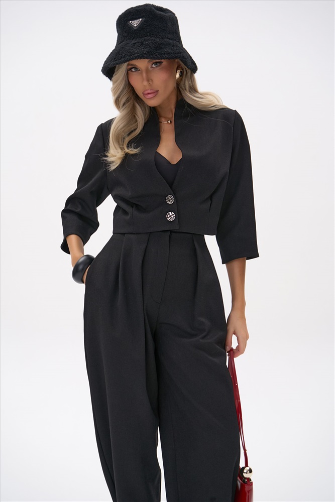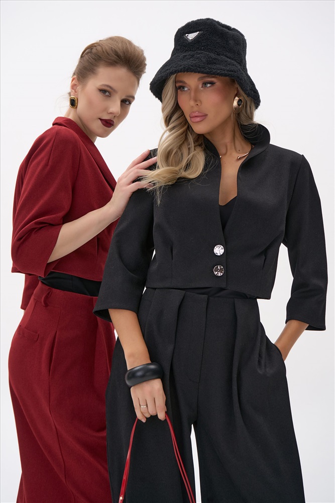 Укороченный жакет с чёткой линией плеча и акцентом на талии создаёт собранный, выразительный силуэт. Лаконичный крой и плотная костюмная ткань подчёркивают чистоту линий, благодаря чему модель выглядит современно и элегантно. Жакет легко сочетается как с брюками из комплекта “Джуди”, так и с базовыми юбками и денимом.