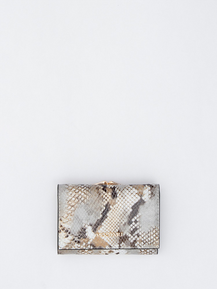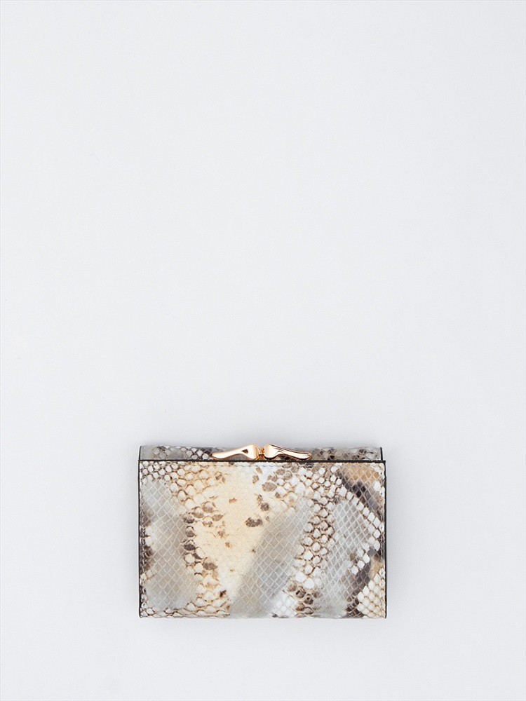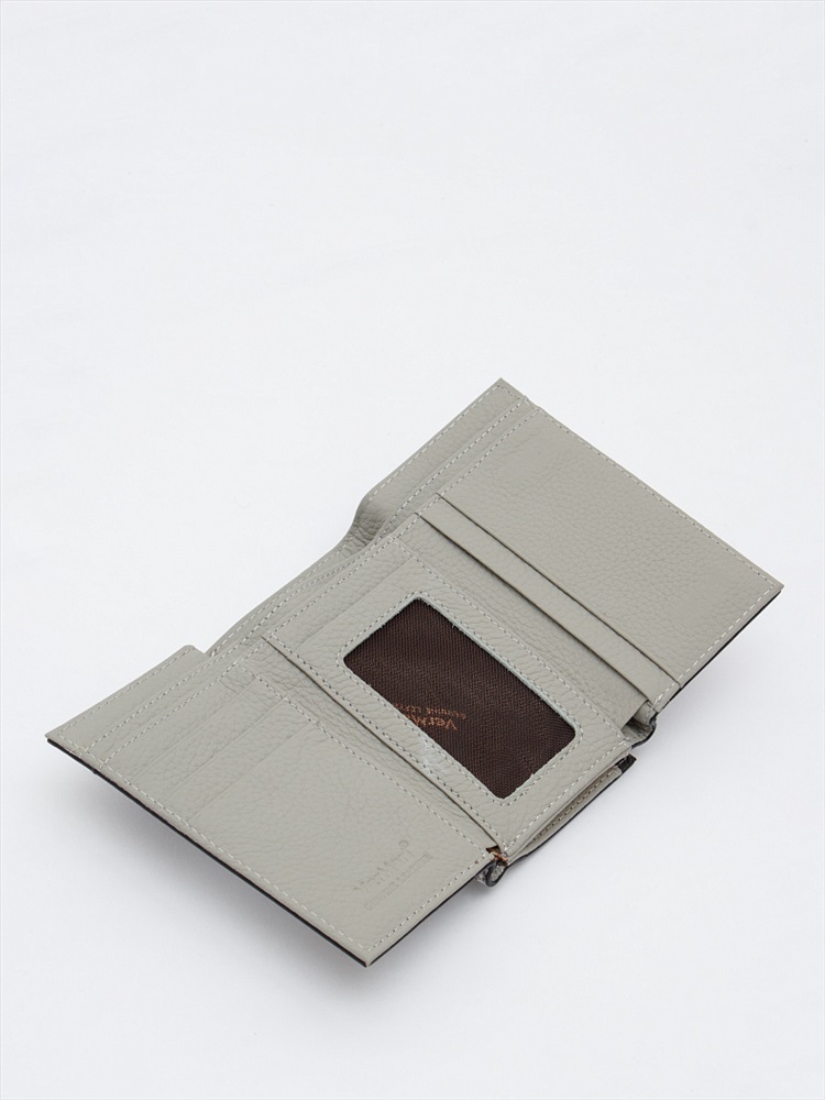 Компактный и вместительный кошелек. Снаружи на задней части есть отдел для монет. Закрывается на фермуар. Кошелек складывается пополам и закрывается на кнопку. Внутри два отдела для купюр и восемь отделом для карт. Фурнитура темное серебро. Каркас полужесткий.