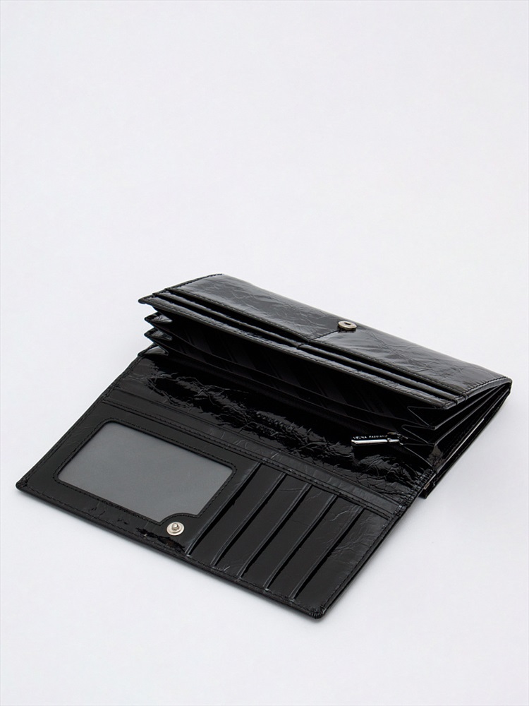 Материал: Натуральная кожа Кошелек женский из натуральной кожи. Модель закрывается на клапан, внутри три открытых отдела под купюр, девять карманов для визиток и пластиковых карт. Снаружи карман закрывается на фермуар.