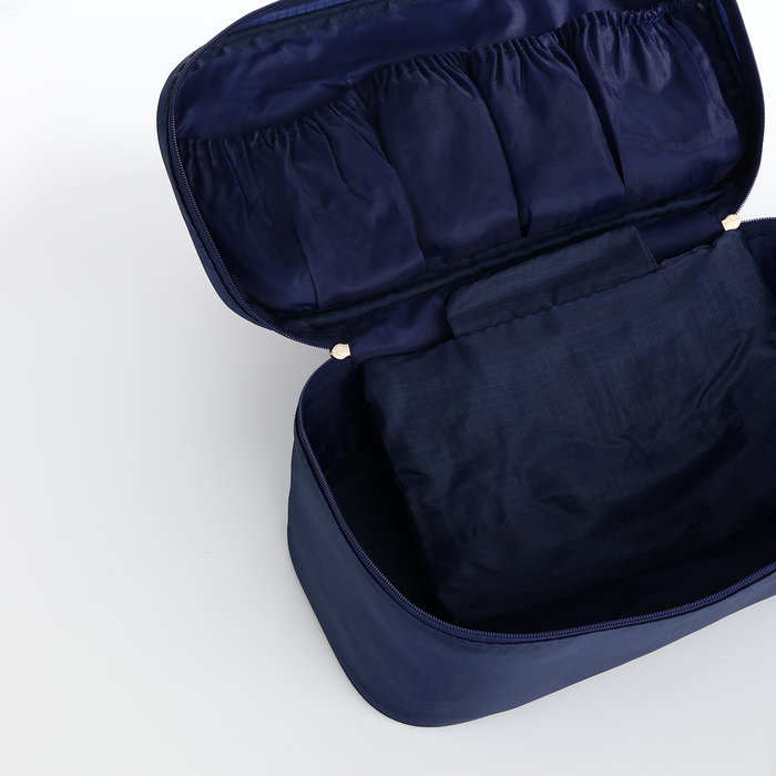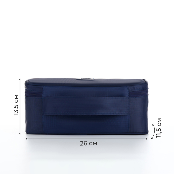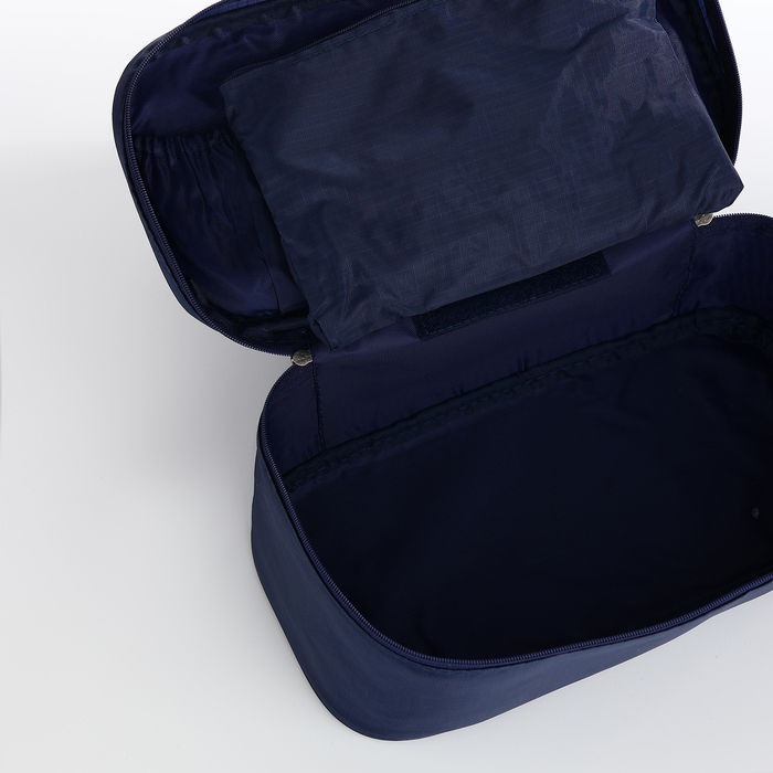 Эта синяя дорожная косметичка создаёт ощущение полной готовности к путешествию. Она подходит всем, кто ценит практичность и вместительность в организации вещей для поездок.