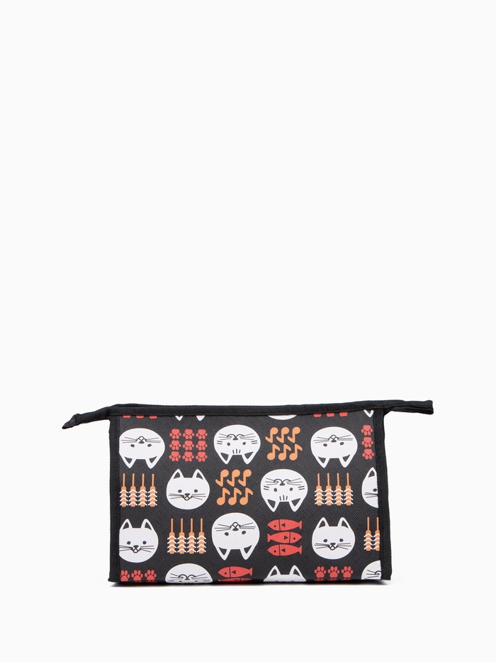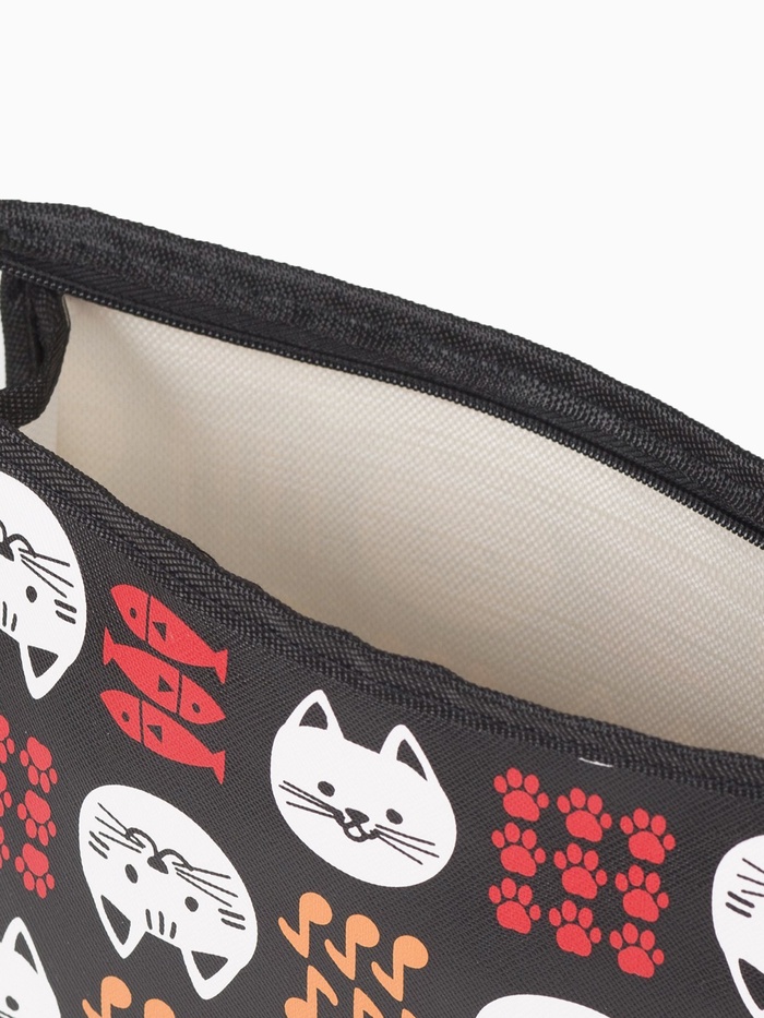 Оригинальная треугольная косметичка с кошачьим принтом — стильный аксессуар для хранения косметики. Чёрная искусственная кожа с контрастным изображением котов и рыбок сочетает практичность и необычный дизайн.