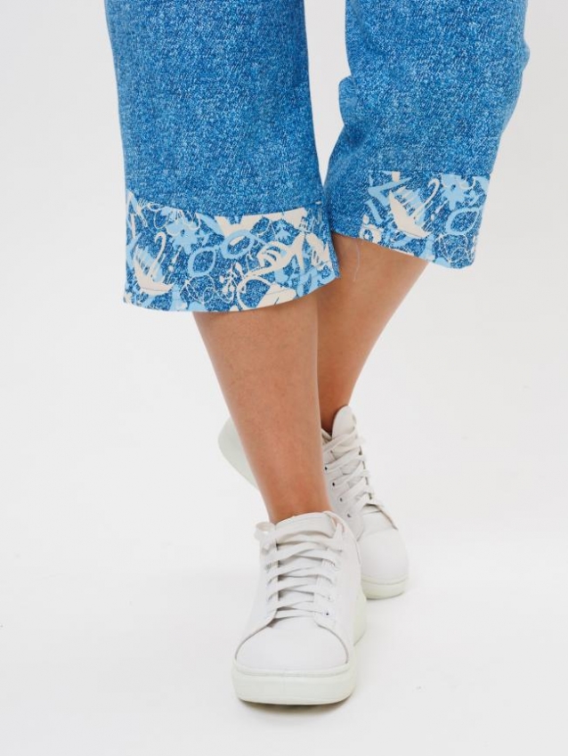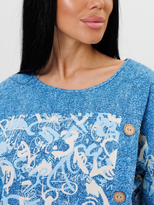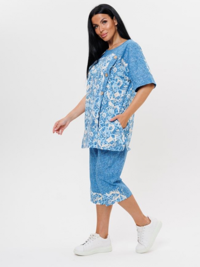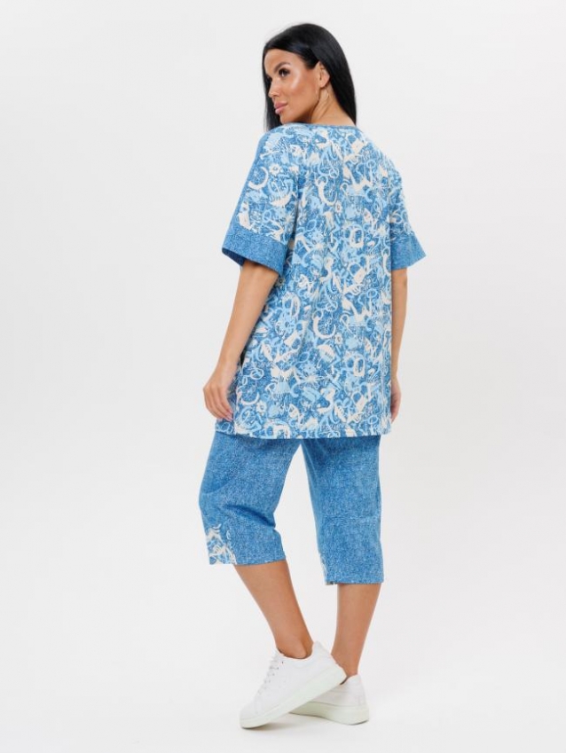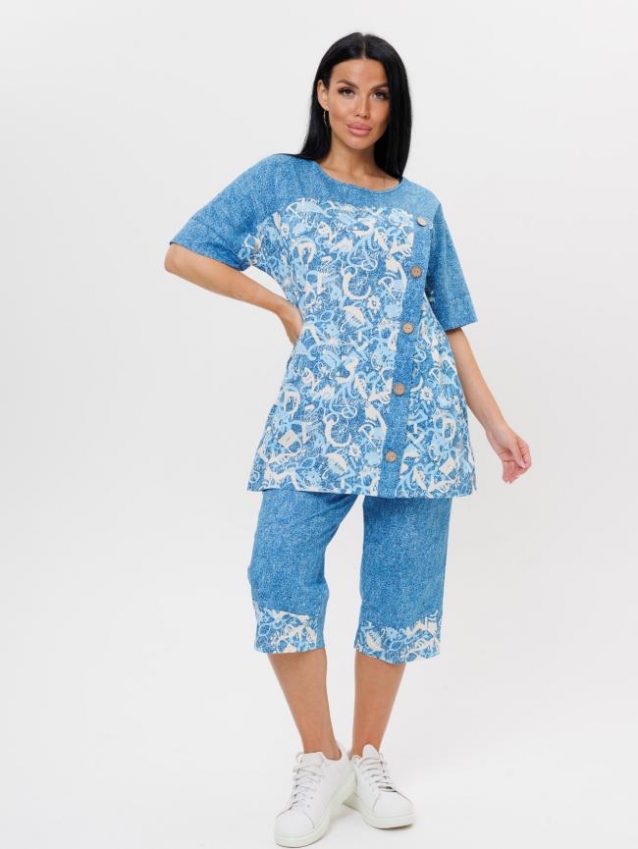Костюм состоит из футболки и бридж. Рукава футболки цельнокроеные с манжетами. Спереди футболка декорирована планкой с пуговицами, карманы располагаются в боковых швах. Дополнительный декор представлен боковыми разрезами внизу футболки. Бриджи декорированы фигурными вставками из ткани компаньона, пояс цельнокроеный на эластичной резинке. Комментарии к товару