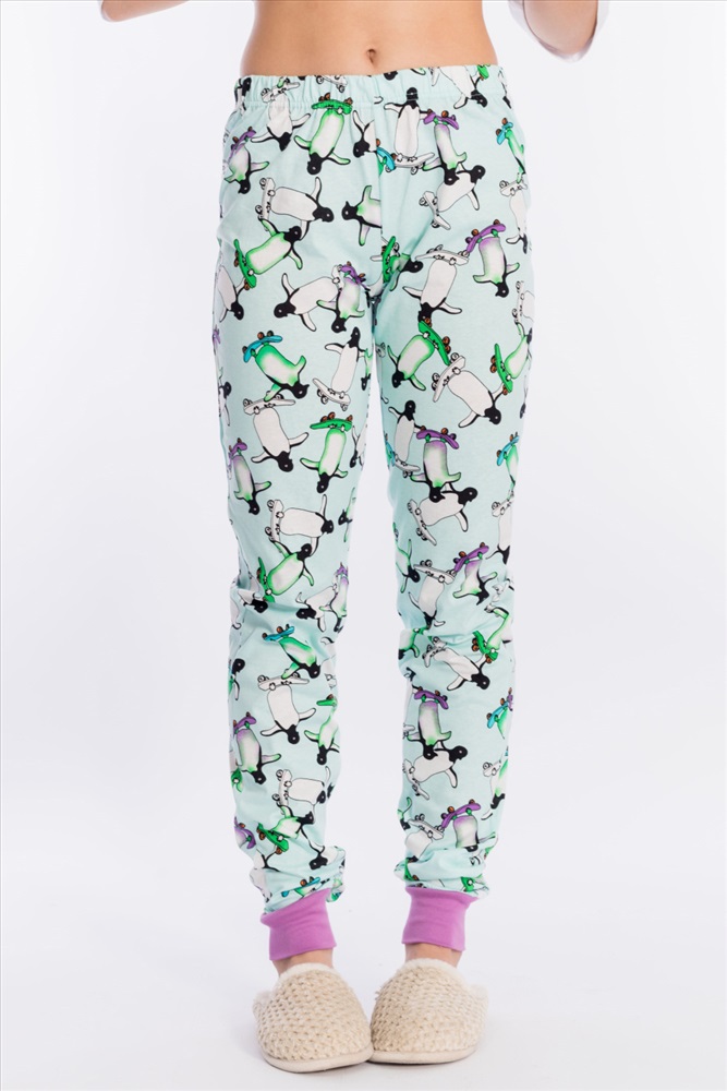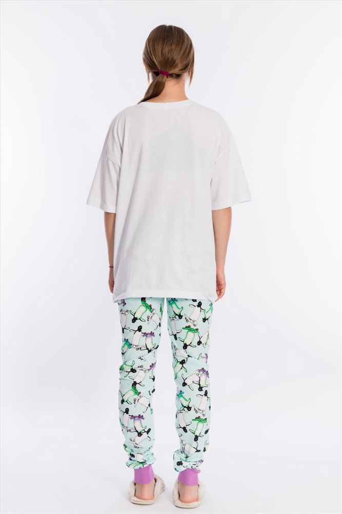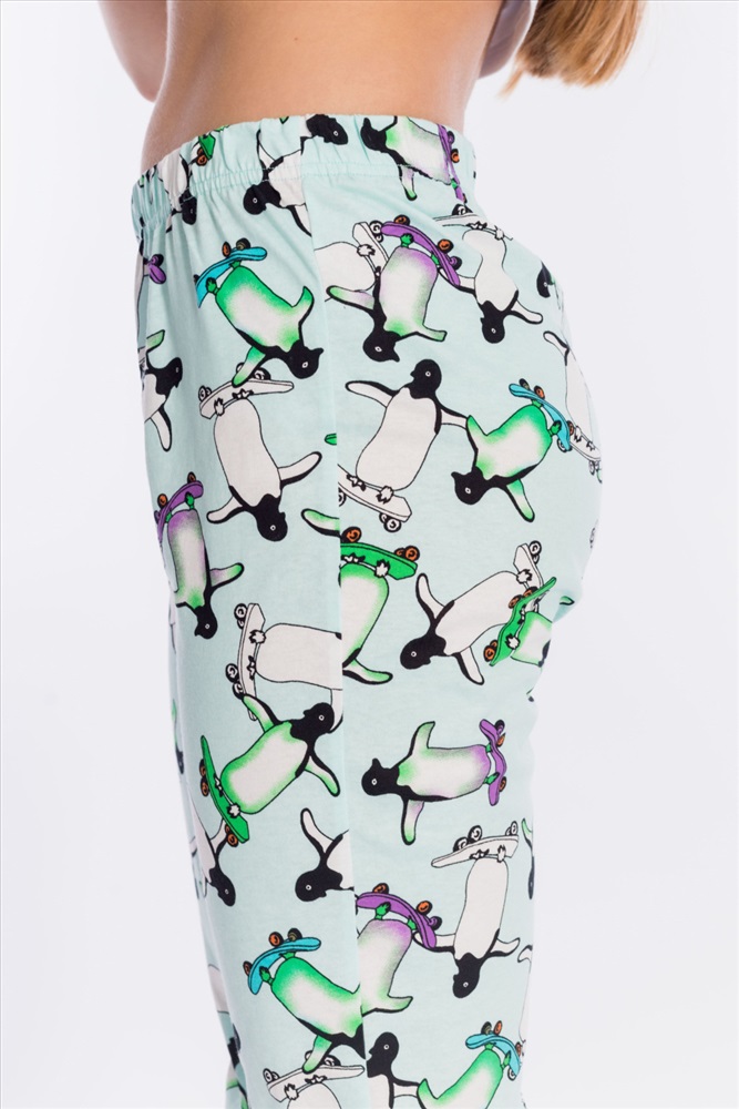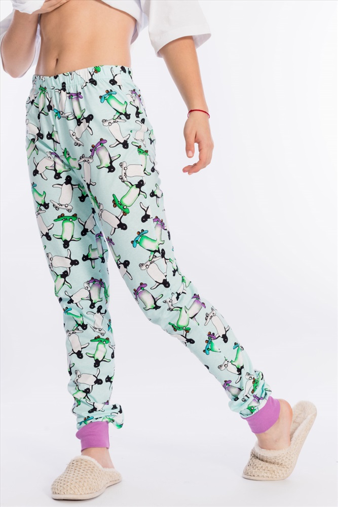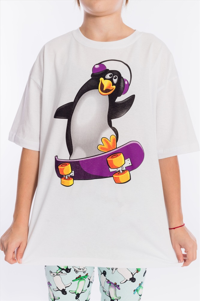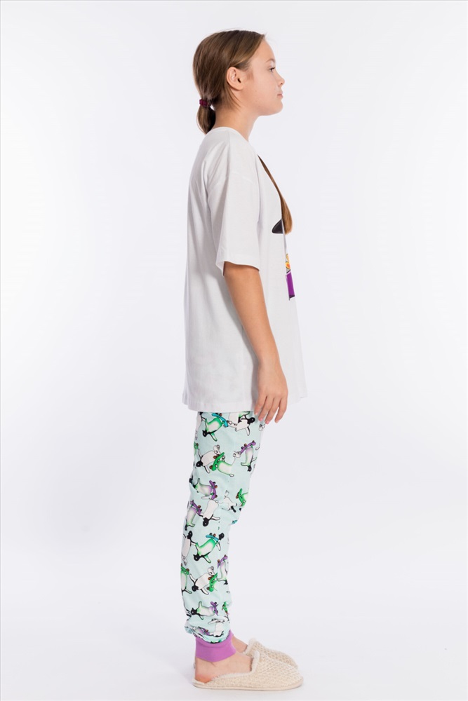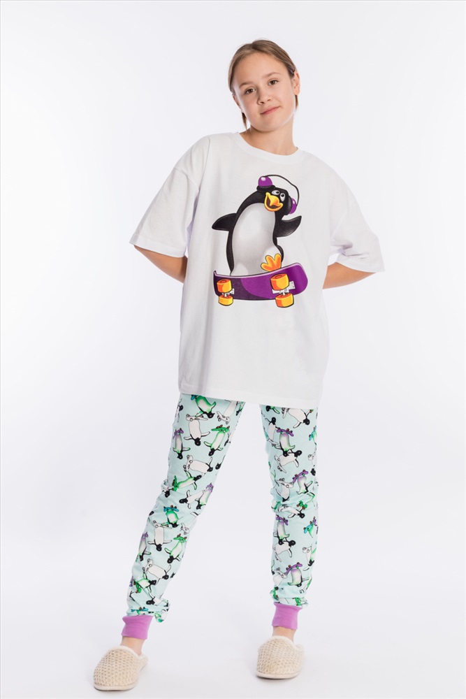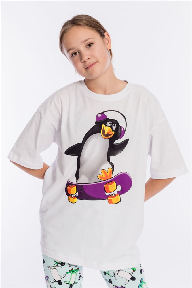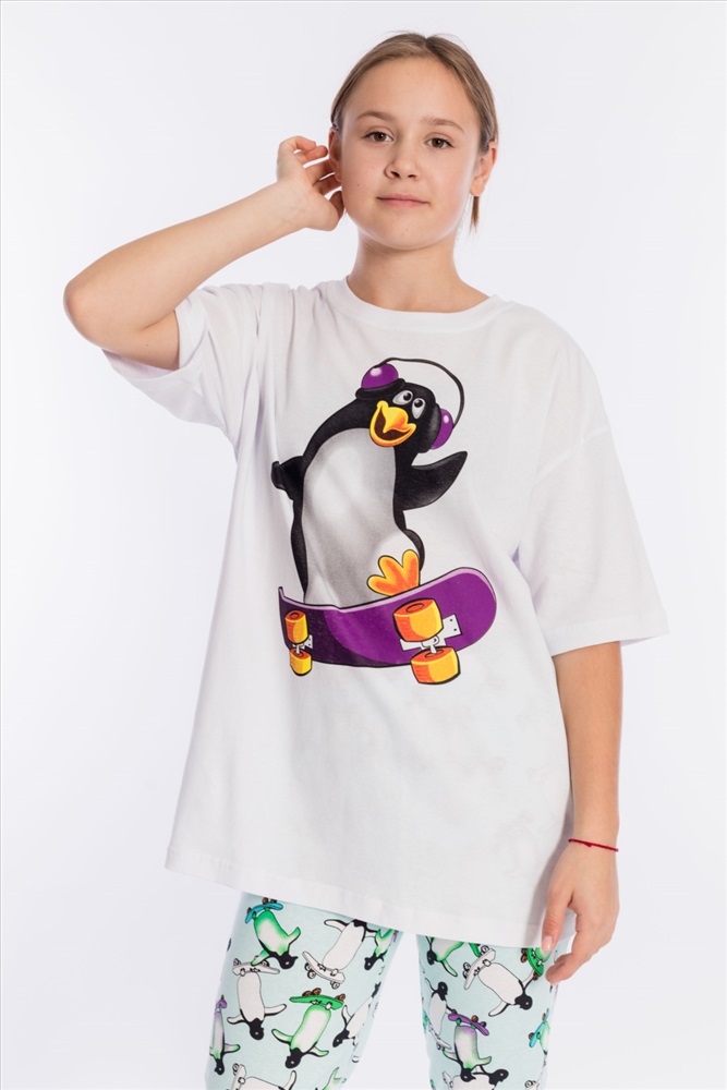 Костюм из кулирки, 100% хлопок, состоит из брюк и футболки. Брюки из кулирки с набивным рисунком, с поясом на резине и манжетами из рибаны. Футболка оверсайз из однотонного полотна, с коротким рукавом и принтом спереди.