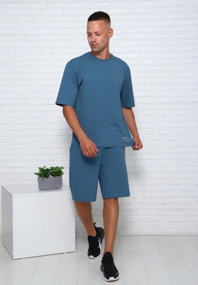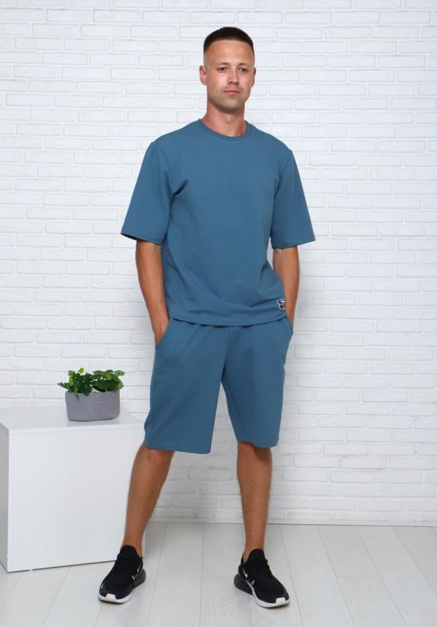 Костюм мужской из футера 2-х нитки: шорты на эластичном комфортном поясе, с боковыми карманами и футболка прямого кроя, со слегка спущенным плечом, с принтом по низу полочки. Данный трикотаж имеет низкую сминаемость и презентабельный вид.