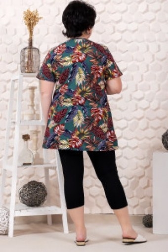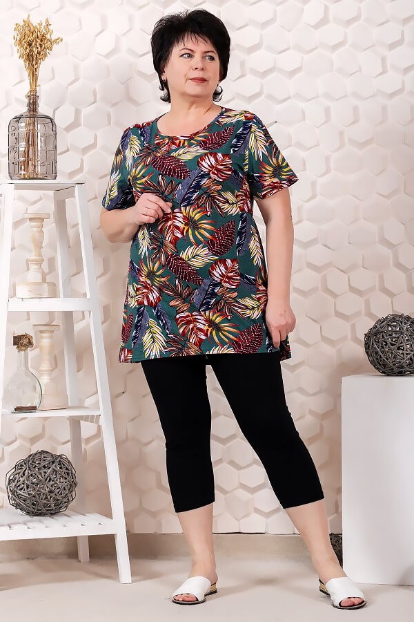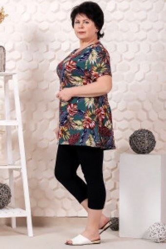 Костюм женский из трикотажного полотна. Футболка полуприлегающего силуэта, с удлиненной спинкой. Рукав втачной базового кроя, короткий. Вырез горловины О-образный. Бриджи прилегающего силуэта на резинке, с карманами в отрезном бочке.
