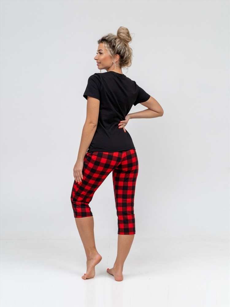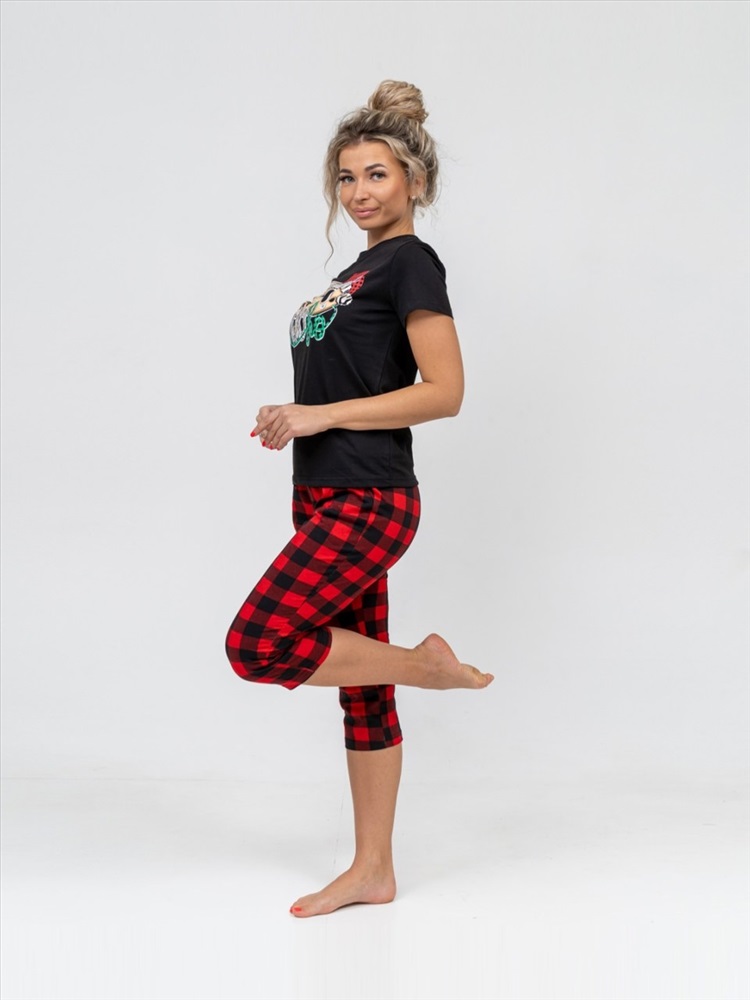 Новогодний костюм из 100% хлопка, уютный и мягкий. Базовая  футболка с яркой новогодней печатью, поднимет Вам настроение. Классические бриджи на резинке с карманами будут идеальным вариантом для дома. Костюм отлично подойдет, как для повседневной носки в предновогодние дни, так и для тематической фотосессии.