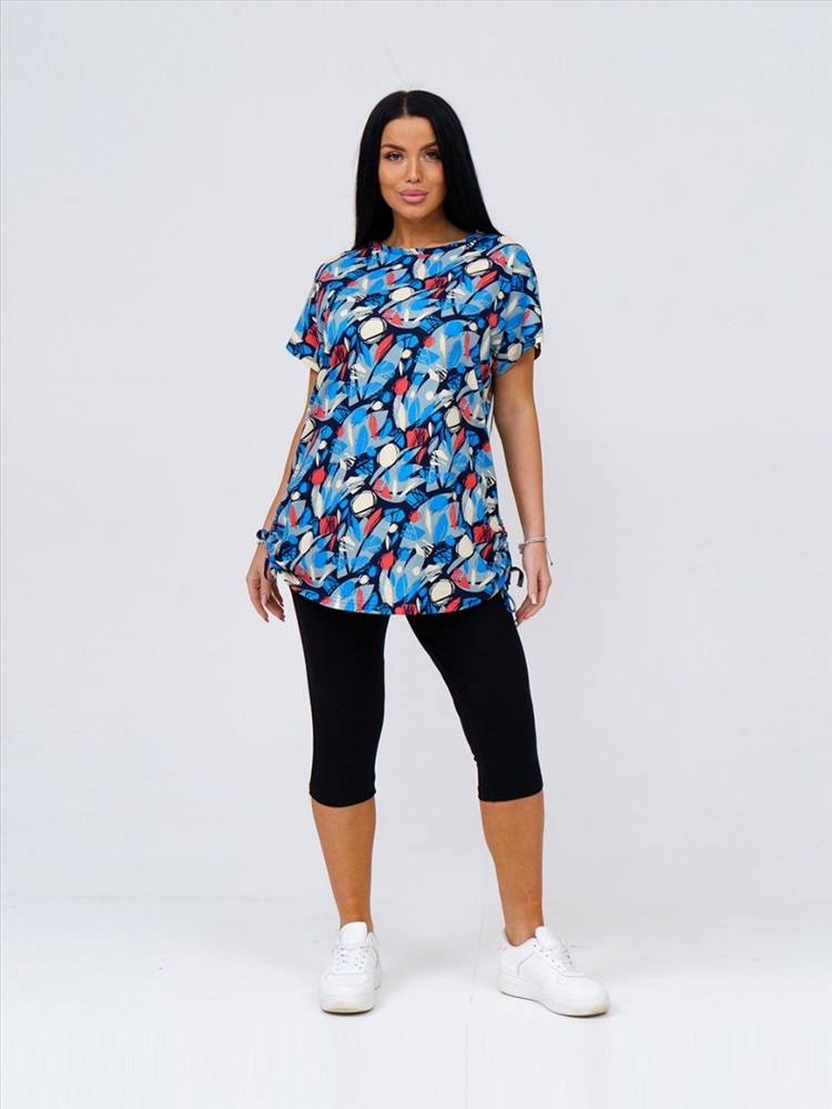 Костюм женский из комбинированного трикотажного полотна, состоящий из бридж и кофты. Кофта полуприлегающего силуэта длинной чуть ниже уровня бёдер. Вырез горловины О-образный. Бриджи из однотонного трикотажного полотна длиной ниже уровня колена. Комментарии к товару