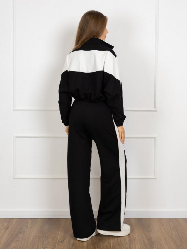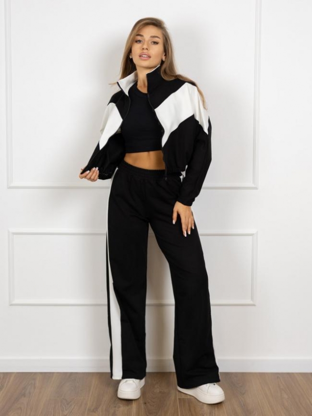 Женский спортивный костюм из футера двунитки. Укороченная олимпийка с резинкой 2 см по низу и по рукаву, V-образные вставки и воротник с внутренней стороны выполнены из футера компаньона, внутри место соединения воротника и основы обработано окантовкой, использована качественная фурнитура. Брюки с широкими лампасами и поясом на резинке, выполненным на поясной машине.