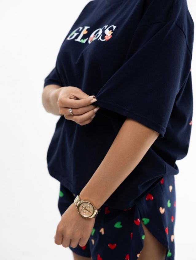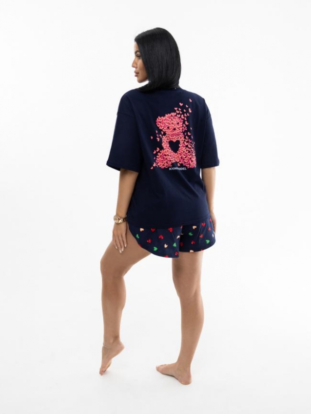 Костюм женский шорты и футболка. Футболка со спущенным коротким рукавом и округлой горловиной. На полочке и спинке печатный рисунок. Шорты - короткие, свободного силуэта, с поясом на резинке и вырезом в области бокового шва, для идеальной посадки и максимального комфорта.