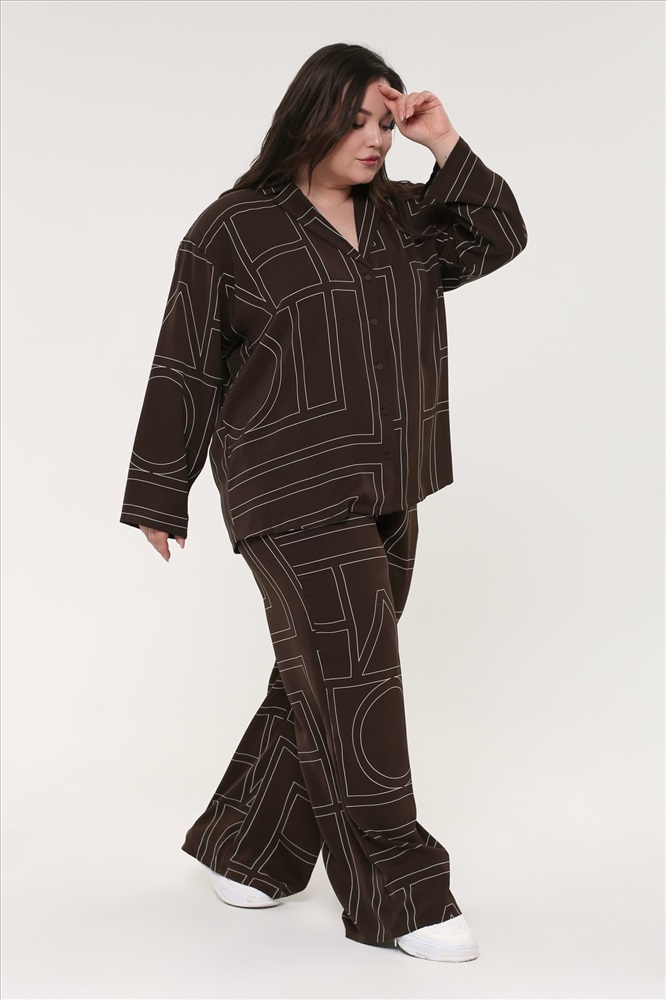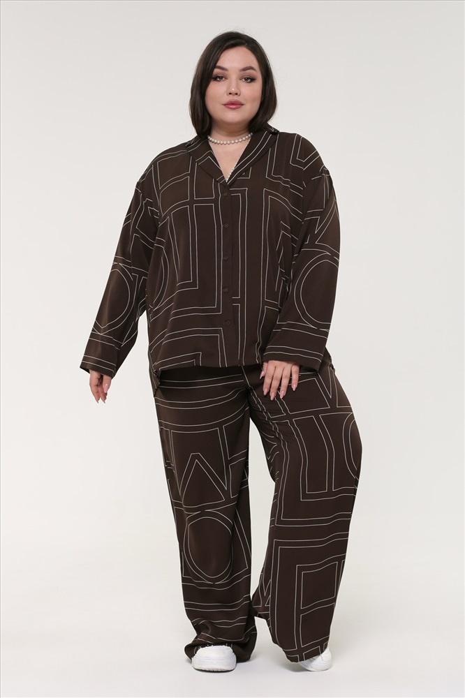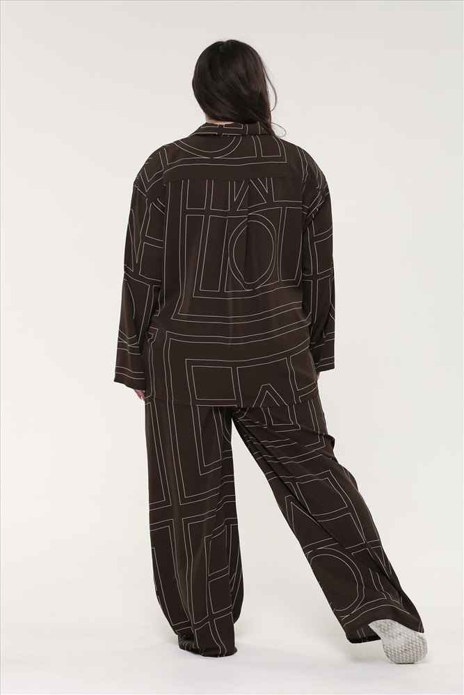 Удлиненная рубашка прямого кроя. V-образный вырез оформлен классическим отложным воротником с лацканами. Свободные приспущенные рукава полной длины. Модель застёгивается на оригинальные пуговки под планку. Кокетка на плечах способствует оптимальной посадке по фигуре. Оригинальный принт добавляет динамичности и освежает образ. Костюм превосходно сочетается как с обувью на каблуках для создания нарядного образа, так и с кедами для более повседневного стиля. Элементы модели можно также носить по отдельности.