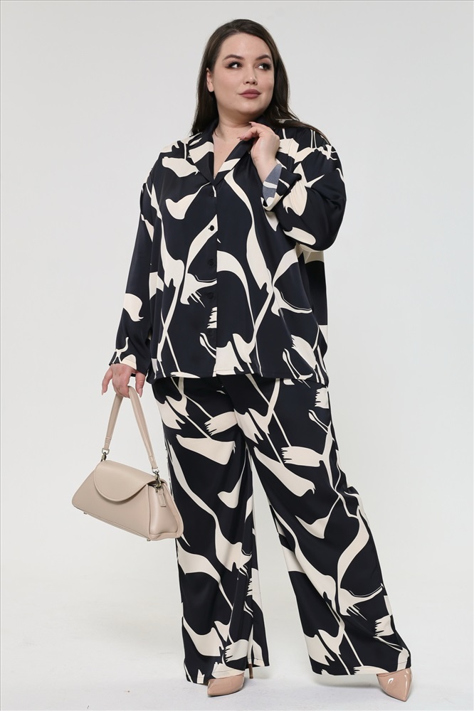 Видео: https-//rutube.ru/embed/a0a4f784849f985dbaab2f7fb300fafa/ Цвет: Зеленый Фасон: Костюм брючный Материал: Искуcственный шелк Длина рукава: Длинный рукав Параметры модели: Рост 173 см, Размер 54 Костюм брючный пижамный "разводы" черный Костюм из мягкого струящегося материала состоит из удлиненной рубашки и брюк. Материал устойчив к деформации и практически не мнется. Удобные брюки-палаццо отлично сидят за счет широкой эластичной резинки на поясе. Имеют завышенную линию талии. Карманы по бокам добавляют практичности. Удлиненная рубашка прямого кроя.  V-образный вырез оформлен классическим отложным воротником с лацканами. Свободные приспущенные рукава полной длины. Модель застёгивается на оригинальные пуговки под планку. Кокетка на плечах способствует оптимальной посадке по фигуре. Оригинальный принт добавляет динамичности и освежает образ. Костюм превосходно сочетается как с обувью на каблуках для создания нарядного образа, так и с кедами для более повседневного стиля. Элементы модели можно также носить по отдельности. Состав: 71%-вискоза; 27%-полиэстер; 2%-эластан.