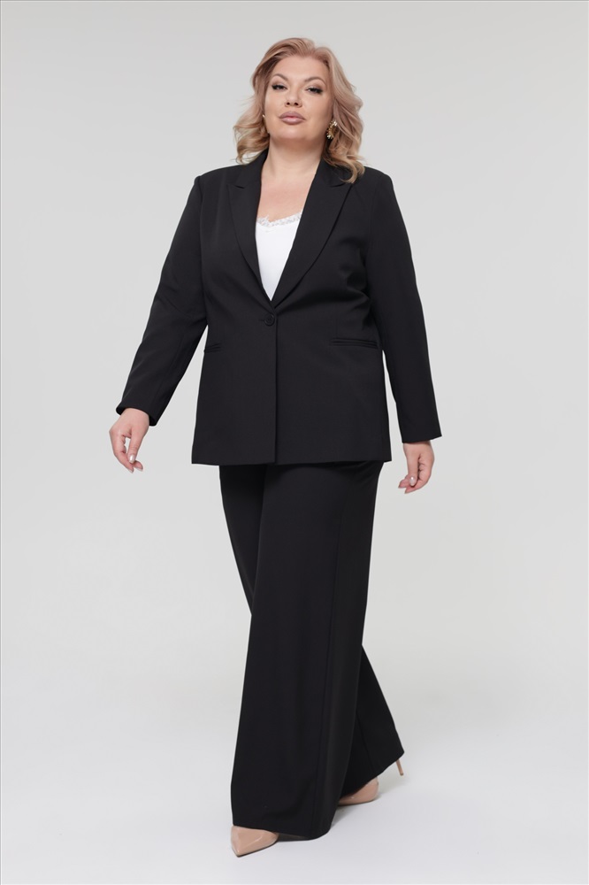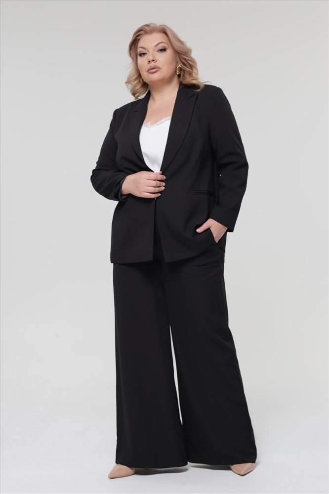 Жакет прямого кроя на подкладке. V-образный вырез оформлен классическим отложным воротником с лацканами. Имеет рукава полной длины. Аккуратные подплечники зрительно вытягивают силуэт и делают бедра визуально у́же. формирующие швы по переду и спинке способствуют оптимальной посадке по фигуре. Модель застёгивается на оригинальную пуговку, что добавляет модели практичности и оригинальности. По бокам декоративные прорезные карманы