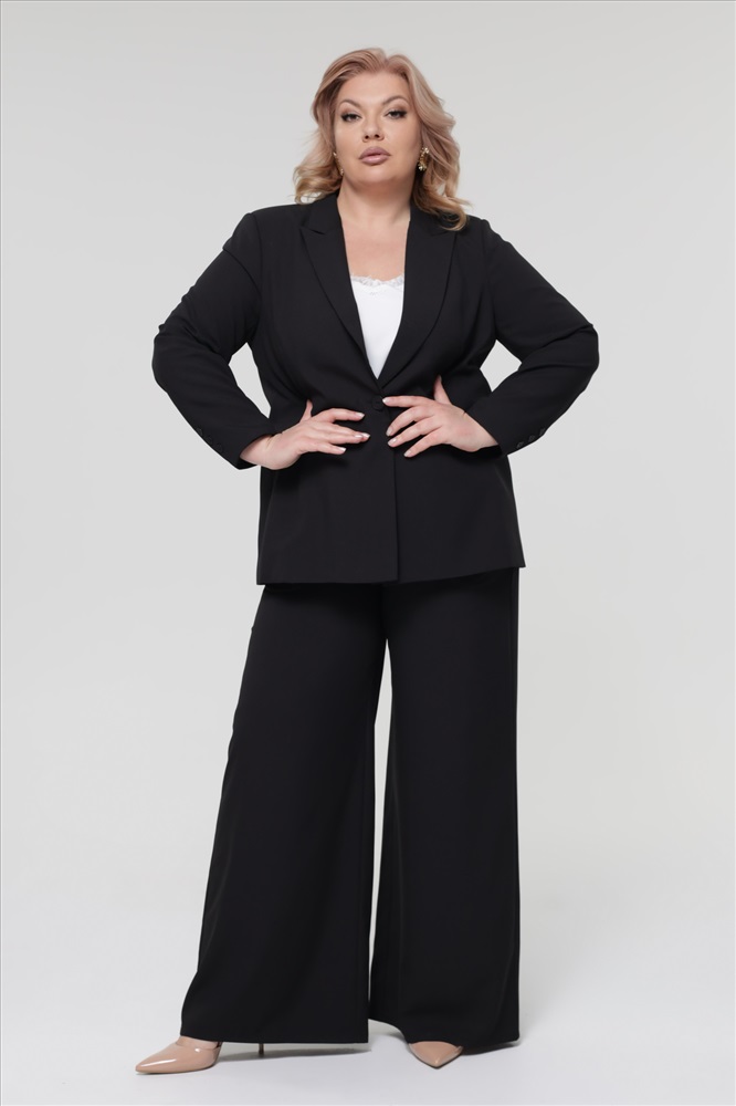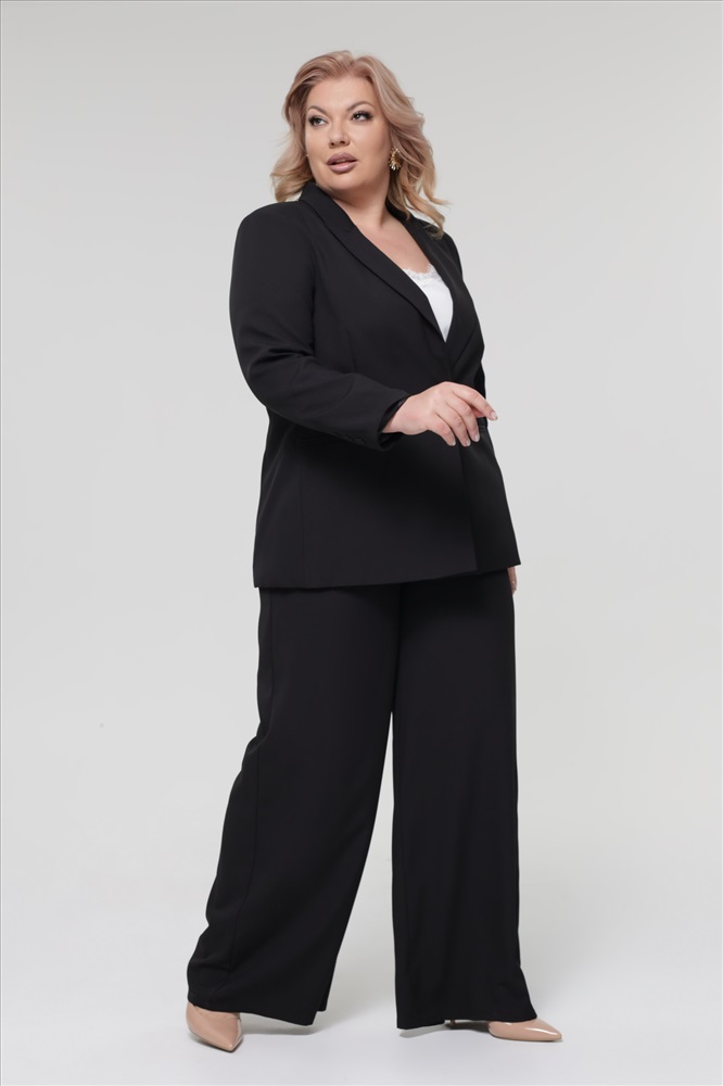 Элегантный костюм из мягкого материала состоит из жакета и брюк.