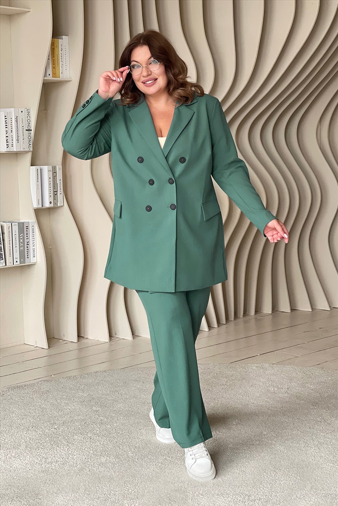 Жакет прямого кроя с V-образным вырезом, который оформлен классическим отложным воротником с лацканами. Передние полочки дополнены атласной подкладкой, по спинке подкладка отсутствует. Рукава полной длины украшены декоративными пуговками. Аккуратные подплечники зрительно вытягивают силуэт и делают бедра визуально у́же. Вытачки на груди и по спинке способствуют оптимальной посадке по фигуре. Модель на двубортной застёжке, что добавляет модели практичности и оригинальности. По бокам декоративные клапаны. При желании талию можно подчеркнуть съемным поясом в тон, который идёт в комплекте.