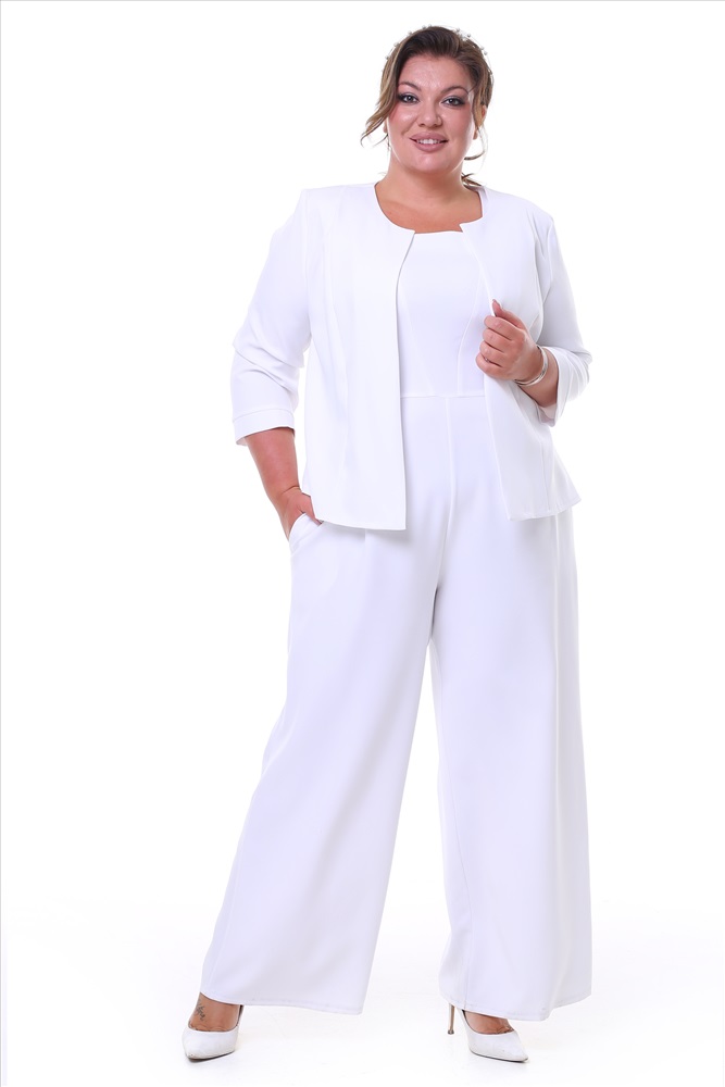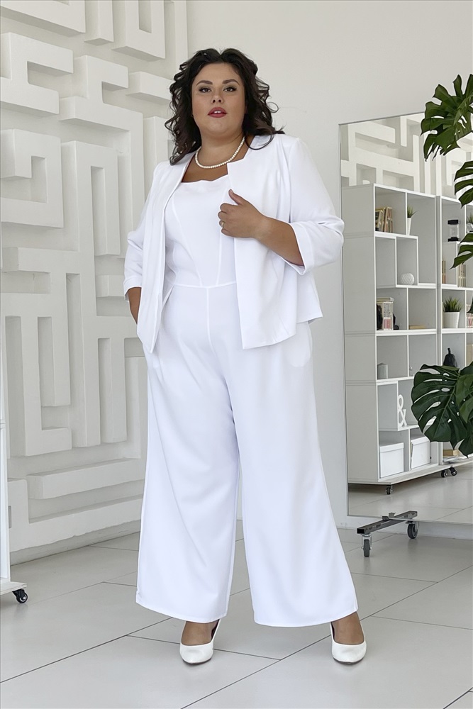 Стильный костюм состоит из жакета и комбинезона. Эффектный комбинезон без рукавов имеет квадратный вырез, что оригинально подчеркивает женственность и изящность. Модель застёгивается по спинке на скрытую молнию. Формирующие швы по переду и вытачки по спинке способствуют оптимальной посадке по фигуре. По бокам практичные вшивные карманы. Модель привлекает внимание широким клешем, что добавляет модели оригинальности.