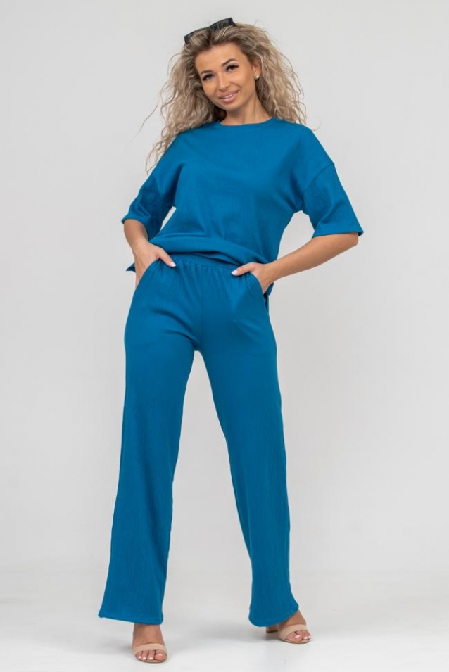 Модный стильный костюм - идеальное решение для тех, кто ищет лёгкую и красивую одежду на каждый день. Костюм, футболка и брюки, выполнен из кулирки гипе жатка компакт. Жатка - это ткань с мятой структурой, декоративными заломами и складками. Имеет много положительных качеств: хорошо тянется, упругая, красивая текстура, неприхотливая в уходе, прочная, износостойкая, не мнётся, не нуждается в глажке и приятная к телу. Футболка выполнена со спущенным рукавом, отстроченной обтачкой по горловине и двумя небольшими разрезами по бокам. На брюках имеется два вместительных боковых кармана и пояс, обработанный на специализированной поясной машине. Данная модель костюма очень удобна в качестве повседневной одежды, а универсальный фасон хорошо скроет недостатки и подчеркнет достоинства фигуры. Свободный крой комплекта двойки не сковывает движения, что делает его очень удобным в носке, резинка не перекручивается, а высокая посадка брюк - палаццо даёт ощущение комфорта. Такой костюм можно использовать как в качестве костюма для фитнеса, так и как вариант домашнего костюма, в нем также можно поехать на дачу или отправиться на вечернюю прогулку. Однотонный дизайн летнего брючного костюма без принта, надписей и декоративных элементов будет гармонировать с любым стилем одежды, а дополнить образ с модным костюмчиком можно любимыми аксессуарами и украшениями. Свободную футболку и брючки можно носить как вместе, так и отдельно. Футболку с коротким рукавом и разрезами по бокам можно легко сочетать с джинсами, юбками и шортами. К брюкам с карманами можно также подобрать любой верх. Образ с костюмом можно дополнить кроссовками, кедами или туфлями. Мягкий, прочный, хлопковый материал не дает усадку, не теряет форму после стирки и не линяет, его можно стирать в режиме бережной стирки при 30 градусах. Также данный трикотажный костюм не скатывается и не вытягивается за счет небольшого количества полиэстера в составе. Такой однотонный костюм с широкими брюками подойдет для разной возрастной категории. Он идеально подойдет для беременных и мам с детьми. Хорошо сядет на высоких и невысоких представительницах прекрасного пола всех возрастов. Такой универсальный прогулочный женский костюм станет отличным подарочным вариантом, его можно подарить маме, дочери, жене, бабушке, подруге или порадовать себя любимую даже без повода. Наш костюм благодаря своей практичности и лаконичному дизайну будет служить Вам долгие годы. Ориентируясь по таблице замеров, обратите внимание, что замеры длины рукава проводились от точки основания шеи.