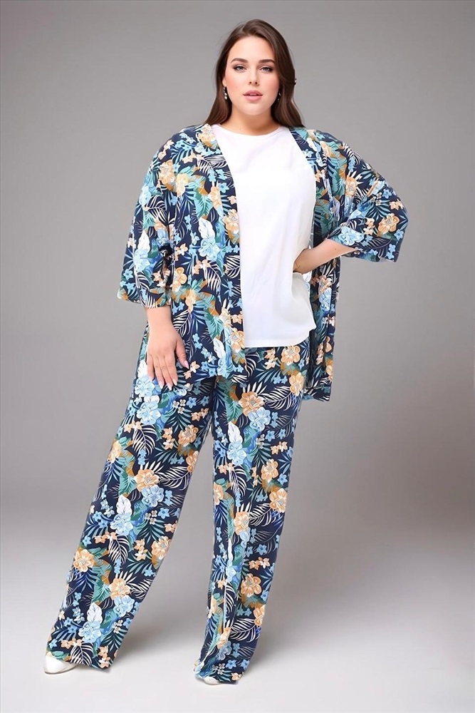 Костюм из мягкого материала состоит из удлиненного жакета, блузки и брюк. Брюки отлично сидят за счет широкой эластичной резинки на поясе по спинке. По бокам практичные карманы. Блузка прямого кроя без рукавов. Круглый вырез оформлен узкой бейкой. Вытачки на груди способствуют оптимальной посадке по фигуре. Жакет без застёжки имеет глубокий V-образный вырез и приспущенные рукава длиной 3/4. Оригинальный растительный принт добавляет модели нарядности и динамичности. Костюм превосходно сочетается как с каблуками для создания нарядного образа, так и с кедами для более повседневного стиля. Модель также можно носить по отдельности.