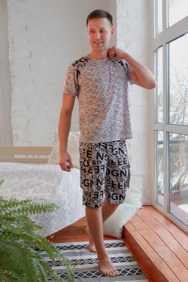 Мужской костюм. В комплекте футболка классического кроя с коротким рукавом. Яркие шорты с карманами, длина чуть ниже колена.