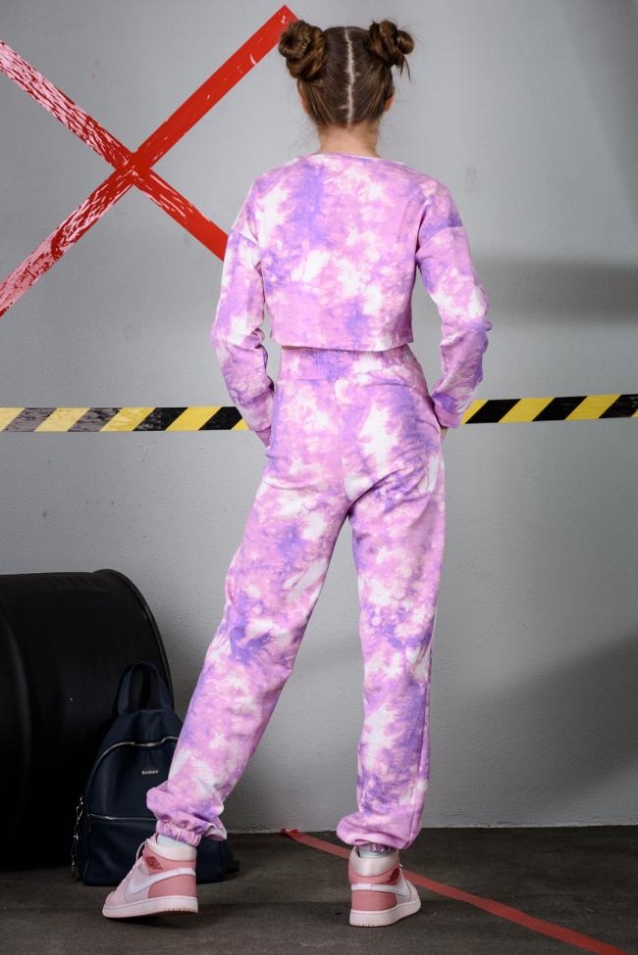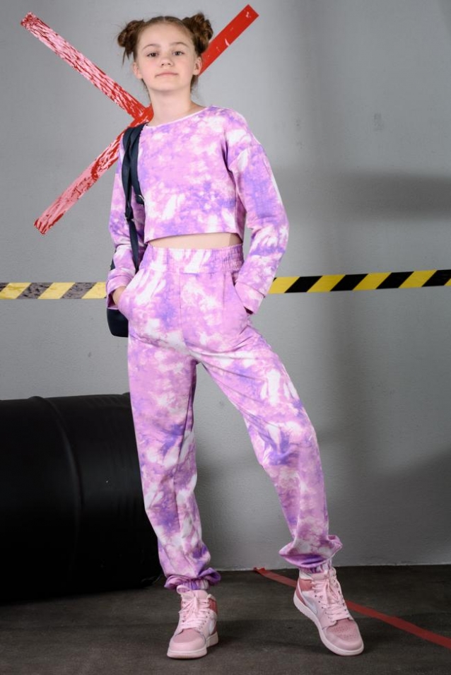 Стильный детский костюм из футера тай-дай, состоящий из кроп-топа с длинным рукавом и джоггерами с завышенной талией. Толстовка со спущенным плечиком, рукава на манжетах. Брюки с широкой резинкой, которая комфортно прилегает к вашему телу. Так же есть взрослый вариант модели 4437.
