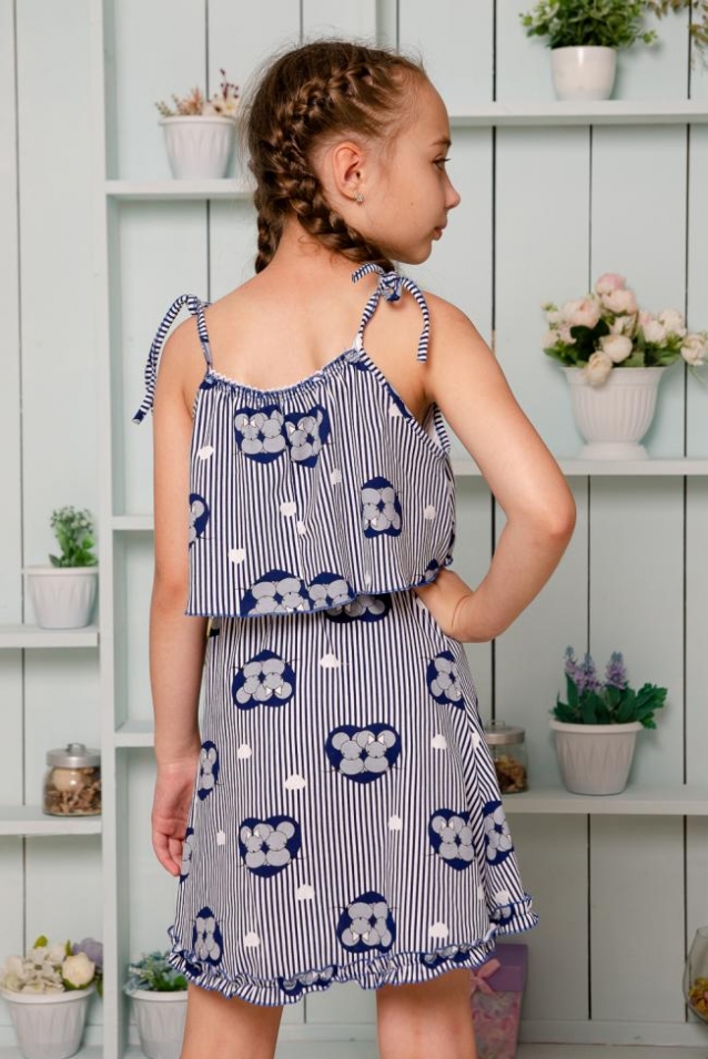 Костюм детский летний с юбкой и топом. Топ свободный на тонких брителях-завязках, которыми удобно регулировать длину изделия, горловина обработана декоративной ажурной резинкой, низ декоративной краеобметочной строчкой. Юбка расклешенная на запах, по всему нижнему контуру настрочена рюша.
