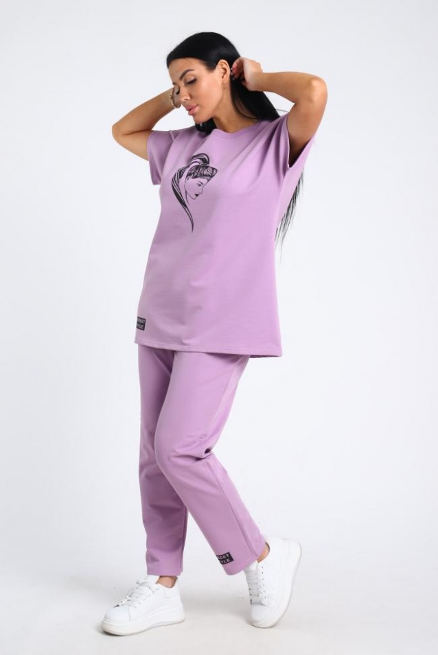 Легкий женский костюм прямого силуэта. Верх двойки - футболка с коротким рукавом и округлой горловиной. Футболка свободная с принтом. Низ - прямые брюки без карманов, пояс на резинке. Данная модель подойдет как и для повседневной носки, так и для дома. Удобный и приятный костюм. Рост модели на фото 165, размер 48.