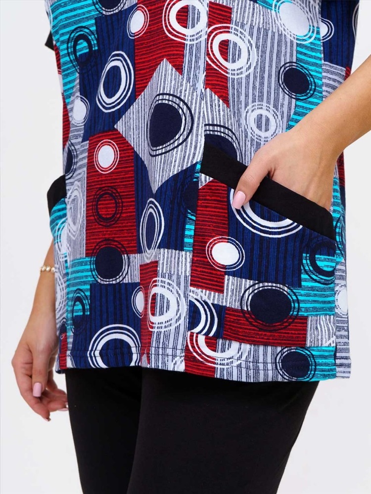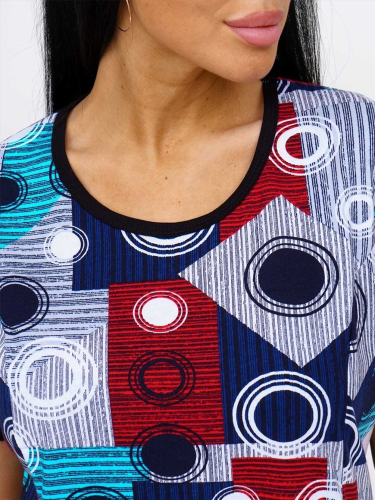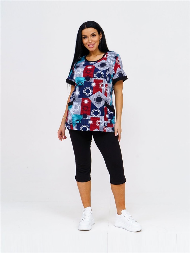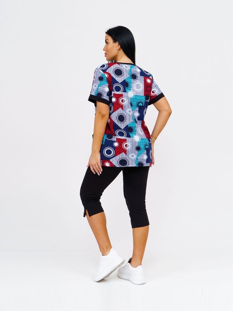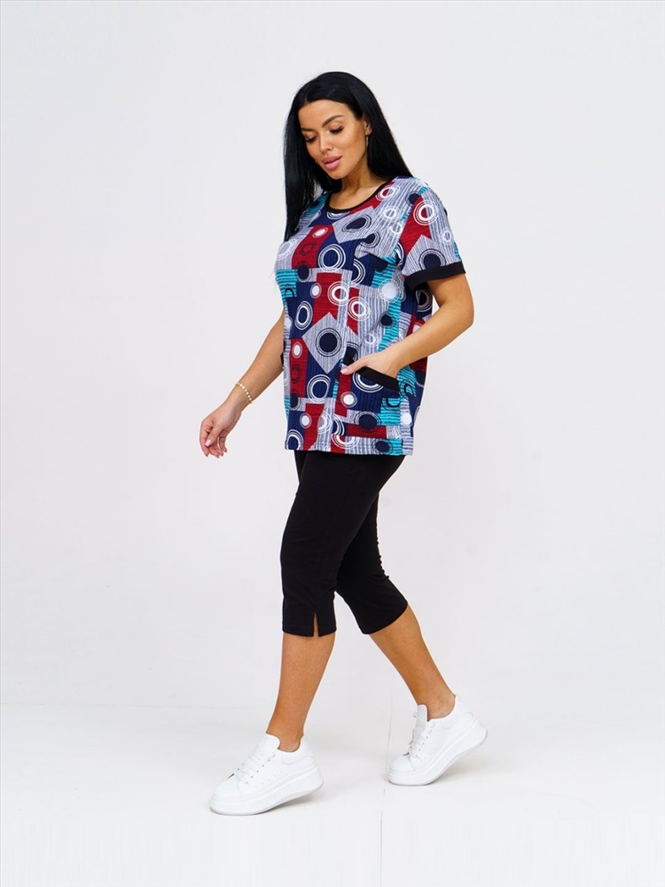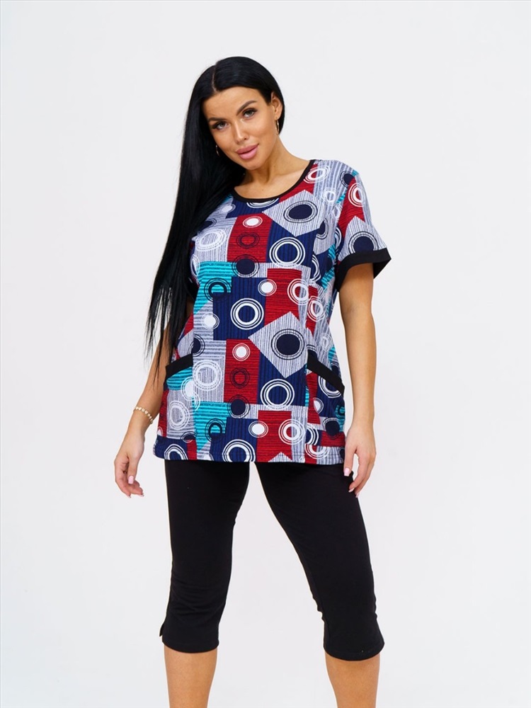 Костюм женский из комбинированного трикотажного полотна, состоящий из бридж и кофты. Кофта полуприлегающего силуэта длинной чуть ниже уровня бёдер из набивного трикотажного полотна с отделкой в цвет бридж. Полочка с рельефами и двумя накладными карманами, на которых имеются планки из отделочного материала. Рукав втачной короткий. Вырез горловины О-образный. Бриджи из однотонного трикотажного полотна длинной ниже уровня колена.