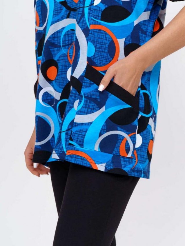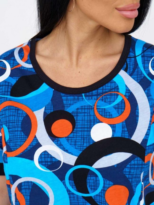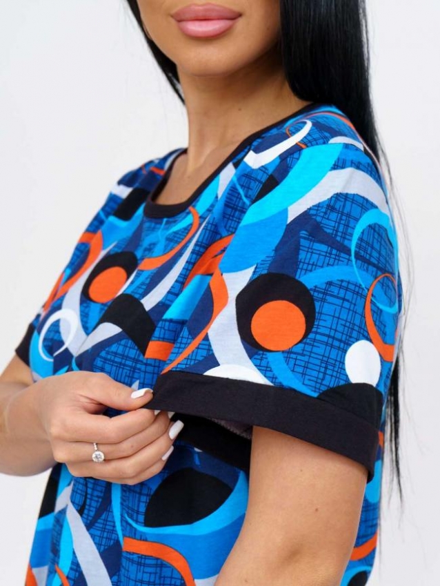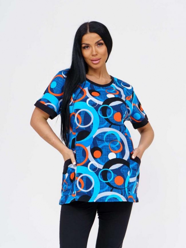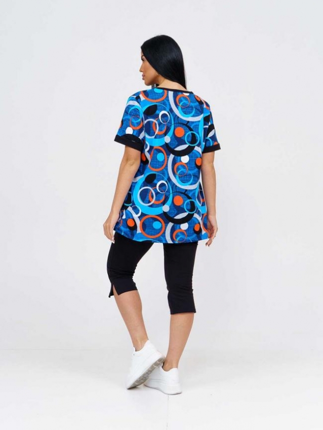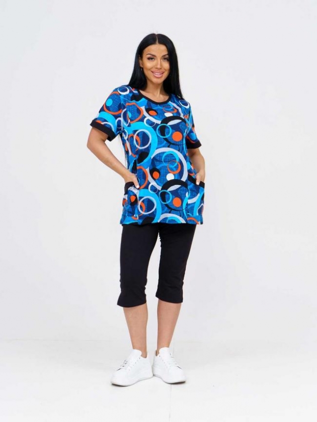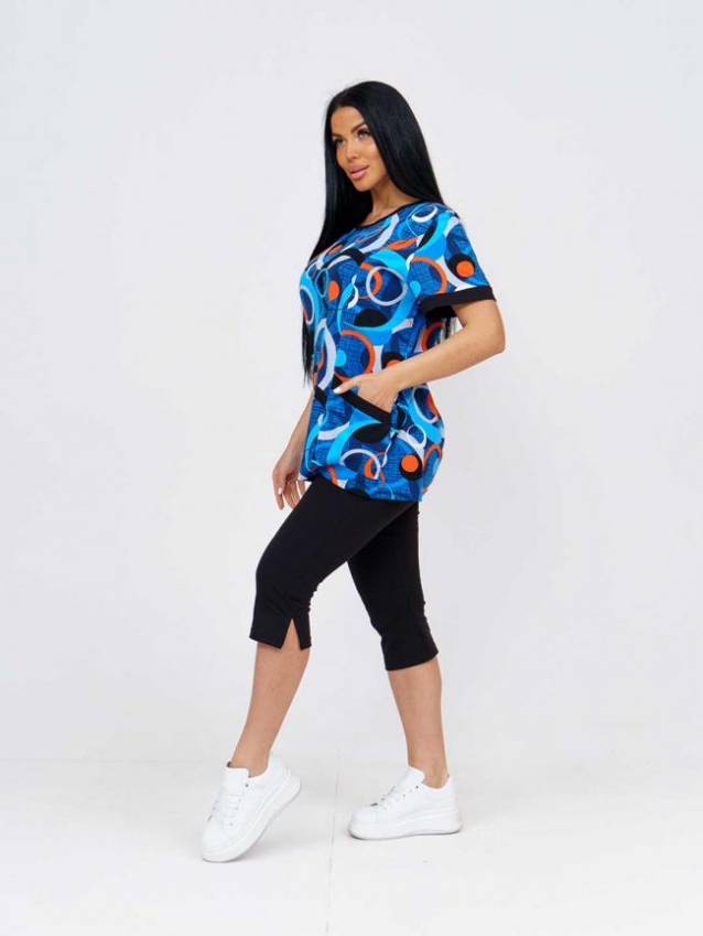 Костюм женский из комбинированного трикотажного полотна, состоящий из бридж и кофты. Кофта полуприлегающего силуэта длинной чуть ниже уровня бёдер из набивного трикотажного полотна с отделкой в цвет бридж. Полочка с рельефами и двумя накладными карманами, на которых имеются планки из отделочного материала. Рукав втачной короткий. Вырез горловины О-образный. Бриджи из однотонного трикотажного полотна длинной ниже уровня колена. Комментарии к товару