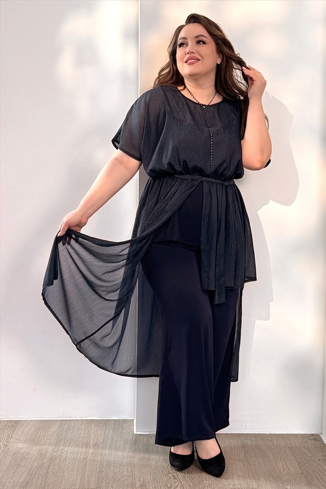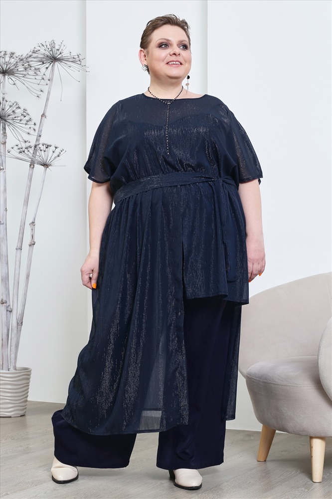 Стильный костюм из мягкого струящегося материала с добавлением нитей люрекса состоит из топа, удлиненной туники и брюк. Классический однотонный топ свободного кроя из струящегося материала на регулируемых тонких бретелях. V-образный вырез добавляет модели женственности и романтизма.